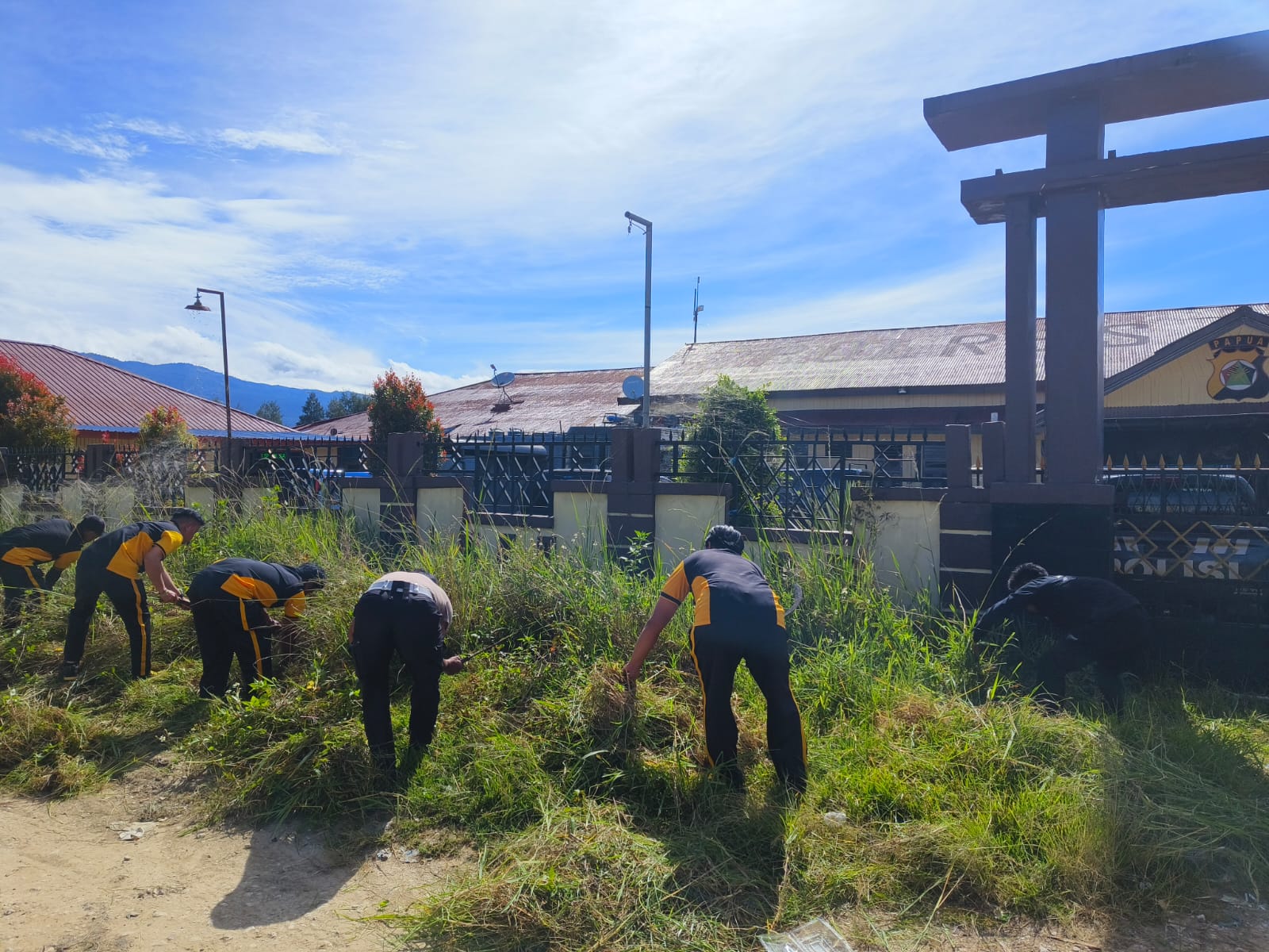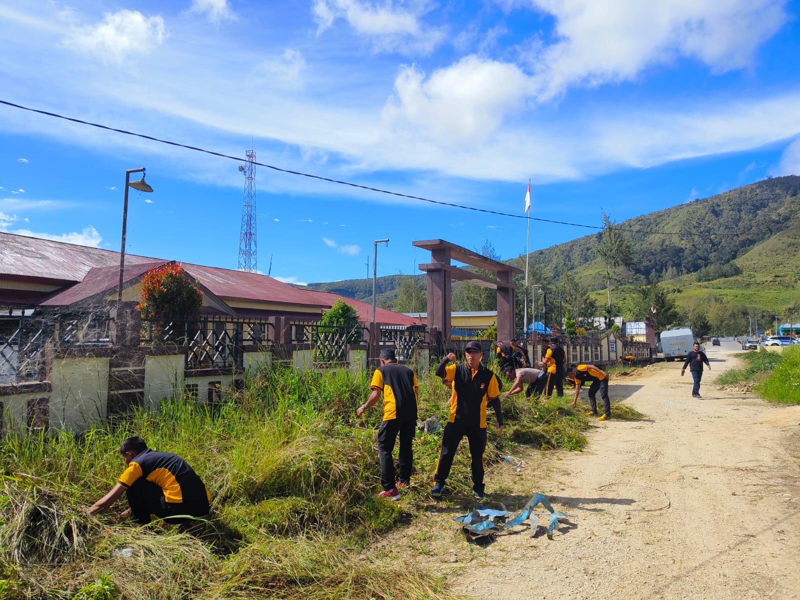 Para anggota Polres Paniai bersama-sama melakukan aktivitas mencabut dan membabat rumput-rumput yang tumbuh secara liar sekaligus menyapu membersihkan sampah-sampah yang ada di lingkungan Mapolres Paniai.