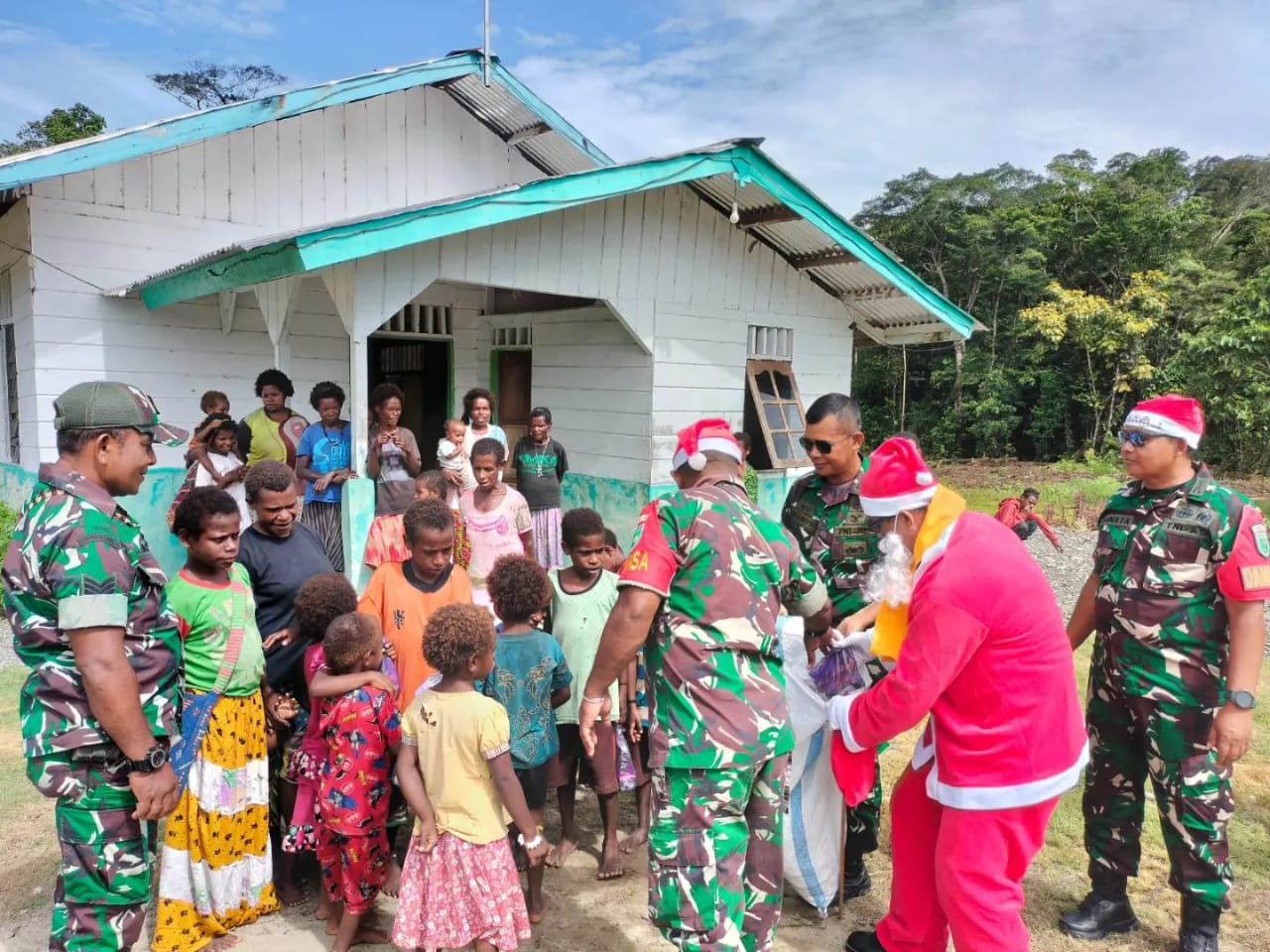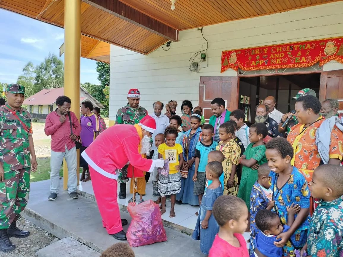 Nabire, Dalam rangka menyambut hari raya Natal 25 Desember 2023, Koramil 1705-07/Siriwo melaksanakan kegiatan kunjungan santa claus dan pembagian bingkisan Natal kepada anak-anak sekolah minggu di Distrik Siriwo, kabupaten Nabire, Provinsi Papua Tengah.