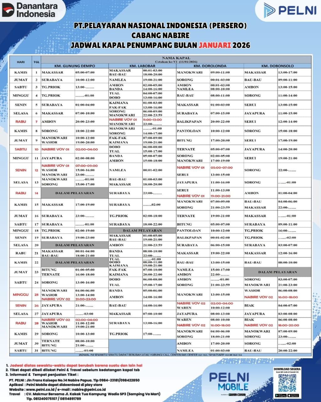 Nabire, 13 Januari 2026 – PT Pelayaran Nasional Indonesia (PELNI) Cabang Nabire menambah satu armada kapal laut untuk meningkatkan pelayanan kepada masyarakat, khususnya dalam mengantisipasi lonjakan penumpang pasca Natal dan Tahun Baru (Nataru) serta menghadapi peak season Lebaran 2026.