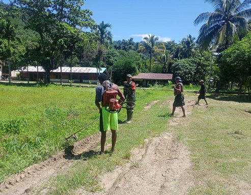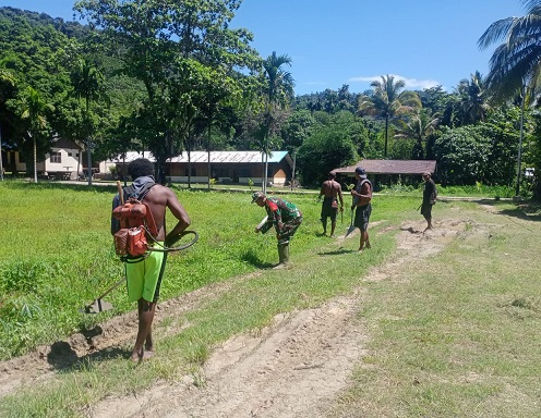 Nabire, Serda Nanang Mujianto selaku Babinsa Koramil 1705-03/Kwatisore melaksanakan kegiatan karya bakti bersama warga dengan membersihkan ruas jalan di Kampung Akudiomi, Distrik Kwatisore, Kabupaten Nabire, Provinsi Papua Tengah, Selasa (19/07/2023).