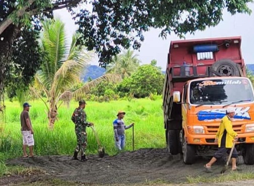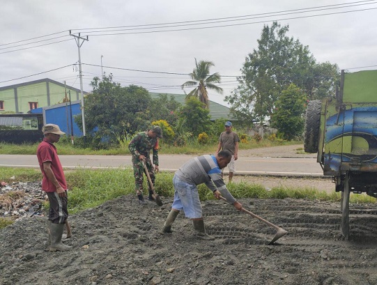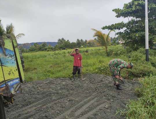 Nabire, Salah satu wujud bakti kepada masyarakat, Babinsa Koramil 1705-01/Nabire, Serka Ahmad Iriyanto, turut hadir membantu penimbunan lahan di jalan poros Kampung Wadio (SP3), Distrik Nabire Barat, Kabupaten Nabire, Provinsi Papua Tengah.