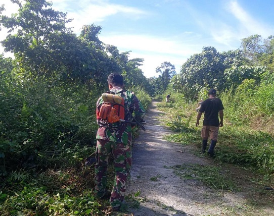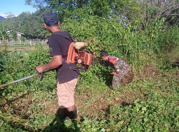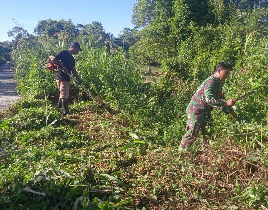 Nabire, Babinsa (Bintara Pembina Desa) dari Koramil 1705/03 Kwatisore, Serka Aswidi, ikut serta dalam aksi gotong-royong bersama warga masyarakat binaan untuk membersihkan ruas jalan di Kampung Sima, Distrik Yaur, Kabupaten Nabire, Provinsi Papua Tengah.