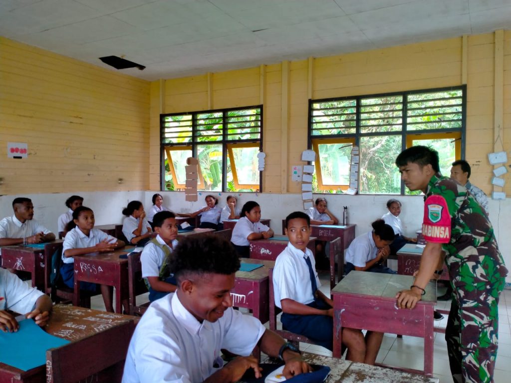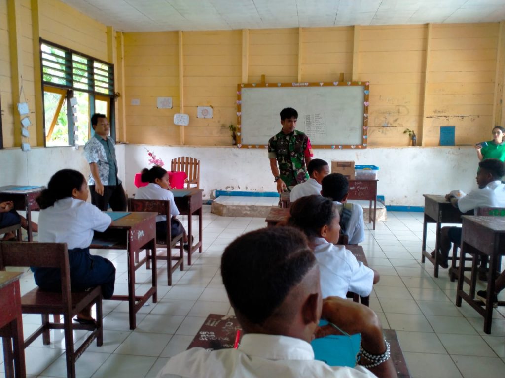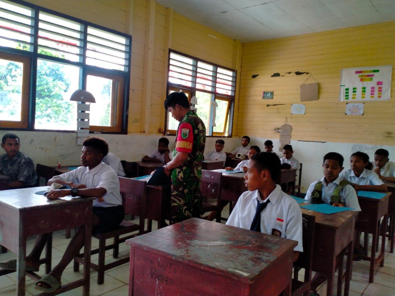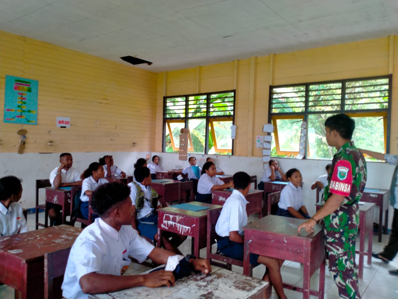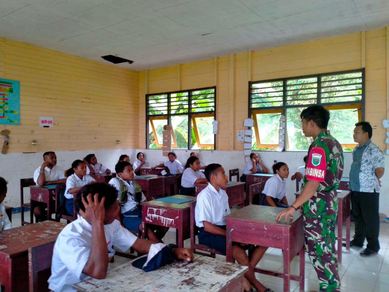 Nabire, Untuk menanamkan rasa cinta tanah air, Babinsa Koramil 1705-03/Kwatisore, Serka R H Tampubolon memberikan materi wawasan kebangsaan (wasbang) kepada pelajar Sekolah Menengah Pertama (SMP) Negeri 2 Yaur, Distrik Yaur, Kabupaten Nabire, Provinsi Papua Tengah, Kamis (14/03/2024).
