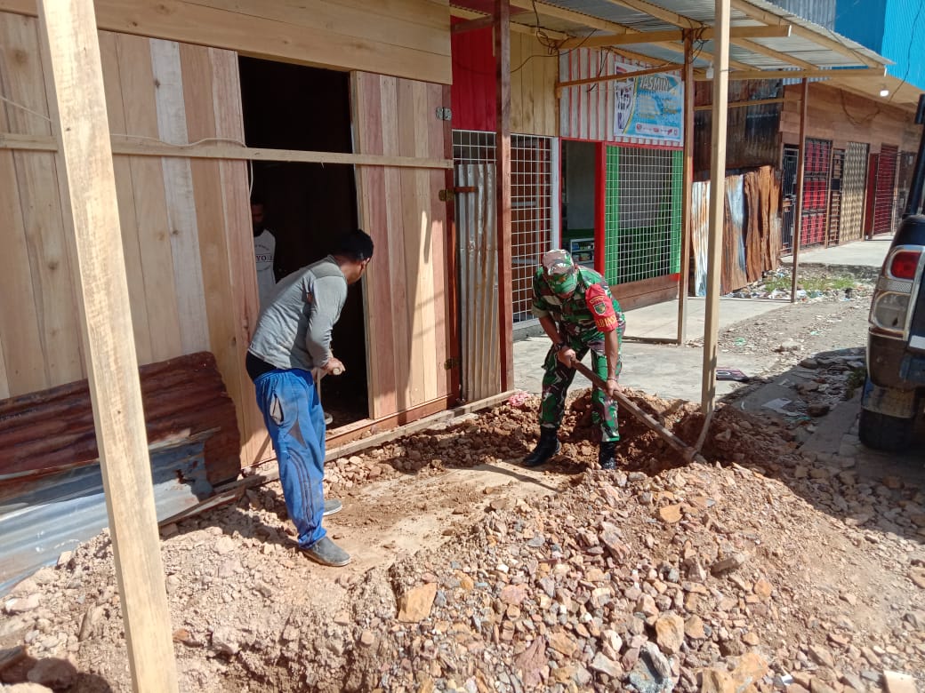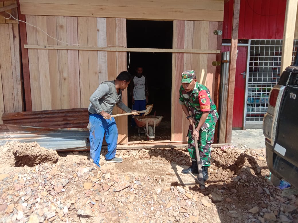Dogiyai, Babinsa Koramil 1705-04/Moanemani, Serma Depris.P, membantu warga membuat kios di kampung Ikebo, Distrik Kamuu, kabupaten Dogiyai, Selasa (31/10/2023).