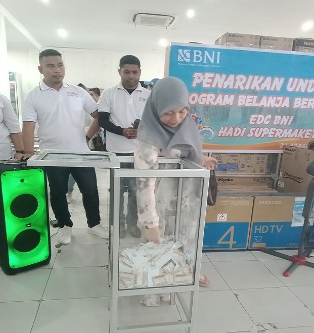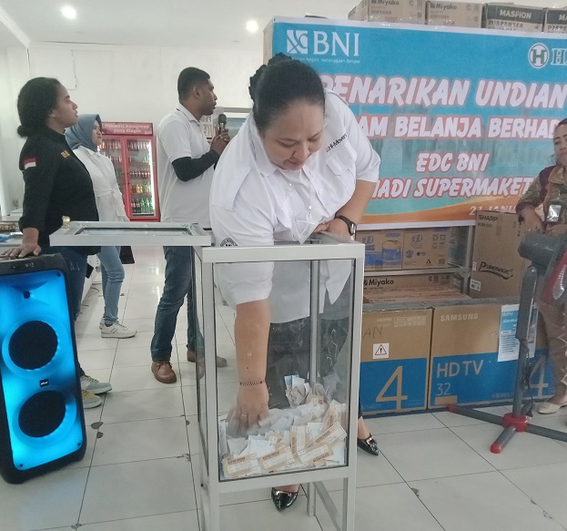 Nabire, Bank BNI Kantor Cabang Pembantu Nabire dan Bank BNI Kantor Kas Pasar SP, melaksanakan Penarikan Undian Program Belanja Berhadiah EDC BNI, bertempat di dua lokasi masing-masing di Loka Mart Bumi Wonorejo dan Hadi Supermarket, Jalan Yos Sudarso, Nabire, Papua Tengah, Sabtu (21/01/2023).