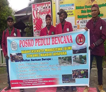 Salah satunya yang menggalang dan mengkoordinir bantuan yang disalurkan kepada korban bencana banjir di Sentani Jayapura adalah Badan Eksekutif Mahasiswa (BEM) Sekolah Tinggi Ilmu Hukum Umel Mandiri Jayapura.