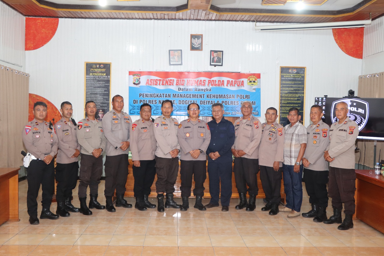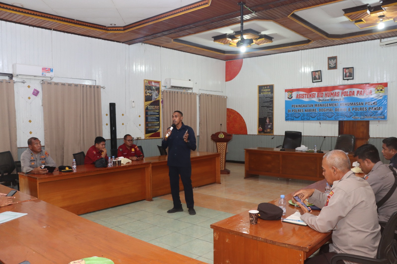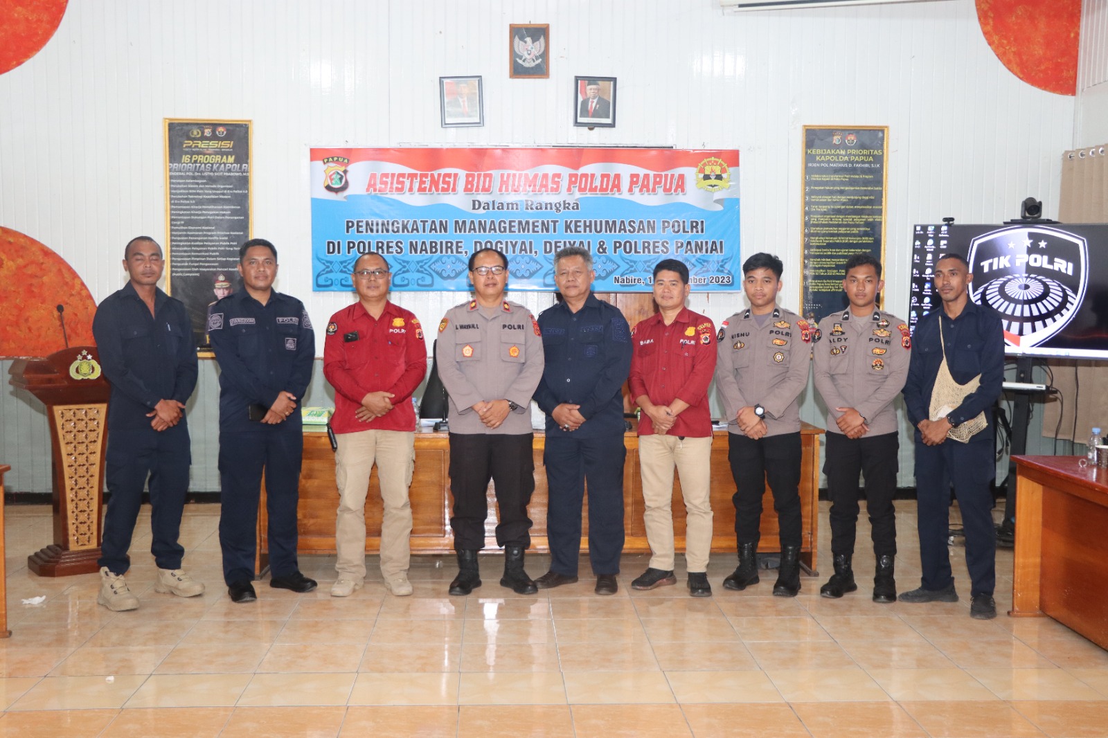 Nabire, Bertempat di ruang RBP Polres Nabire, dilaksanakan kegiatan Asistensi Bidang Humas Polda Papua Dalam Rangka Meningkatkan Manajemen Humas Polri yang diikuti oleh Polres Nabire, Paniai, Dogiyai dan Deiyai, Kamis (12/10/2023).