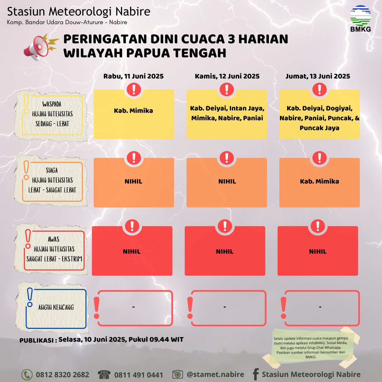 Nabire, 10 Juni 2025 – Badan Meteorologi, Klimatologi, dan Geofisika (BMKG) melalui Stasiun Meteorologi Nabire mengeluarkan peringatan dini cuaca untuk wilayah Papua Tengah selama tiga hari ke depan, yakni 11 hingga 13 Juni 2025. Masyarakat diimbau untuk meningkatkan kewaspadaan terhadap potensi hujan sedang hingga lebat yang dapat disertai petir dan angin kencang di sejumlah wilayah.