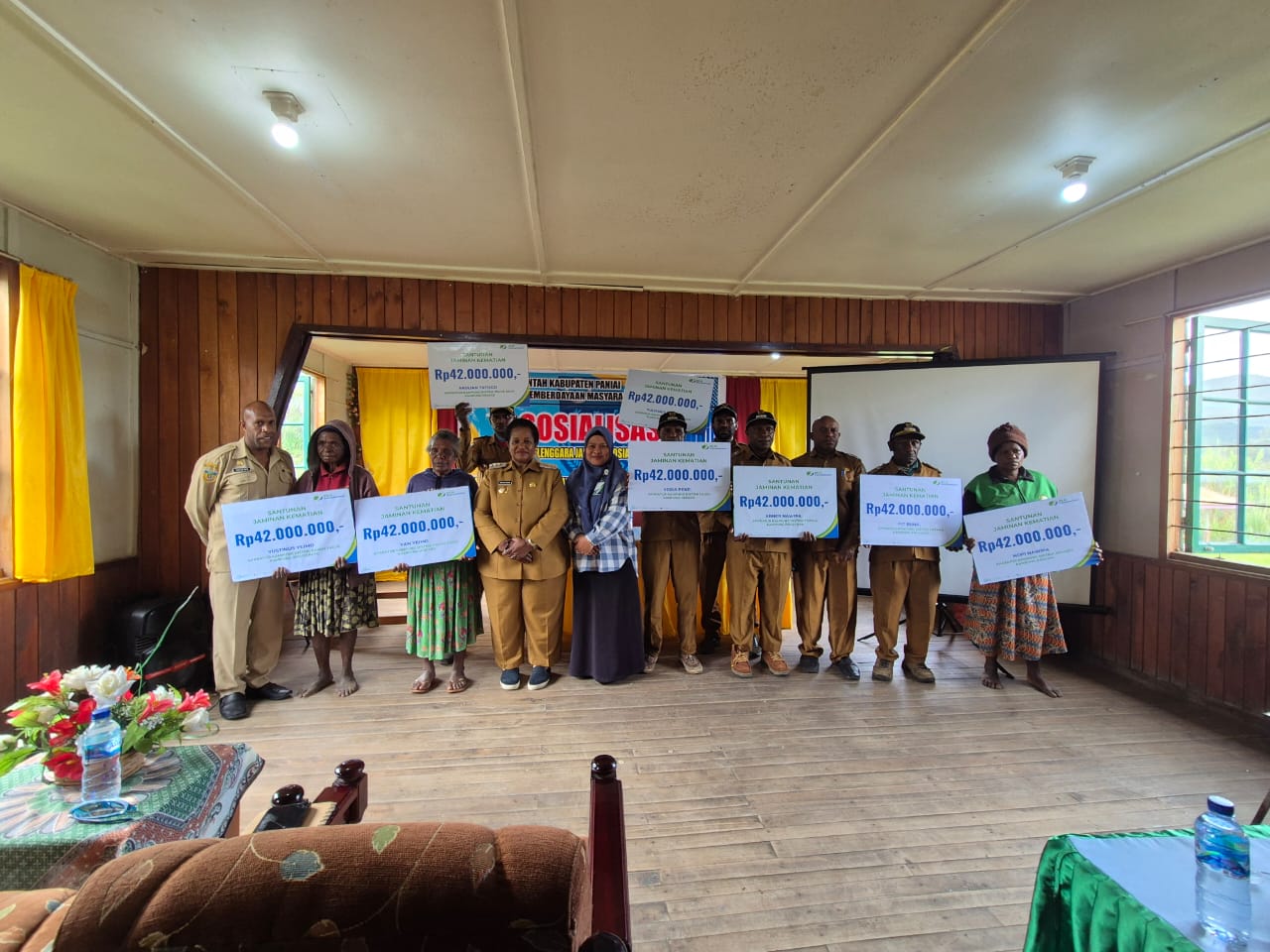 Pada kesempatan ini, Dr. Martha Pigome juga menyerahkan santunan jaminan kematian secara simbolis kepada delapan ahli waris aparatur kampung, masing-masing menerima Rp 42 juta. Bantuan ini menjadi bentuk nyata perlindungan jaminan sosial bagi aparatur kampung di Paniai yang telah mengabdi.