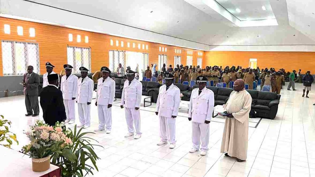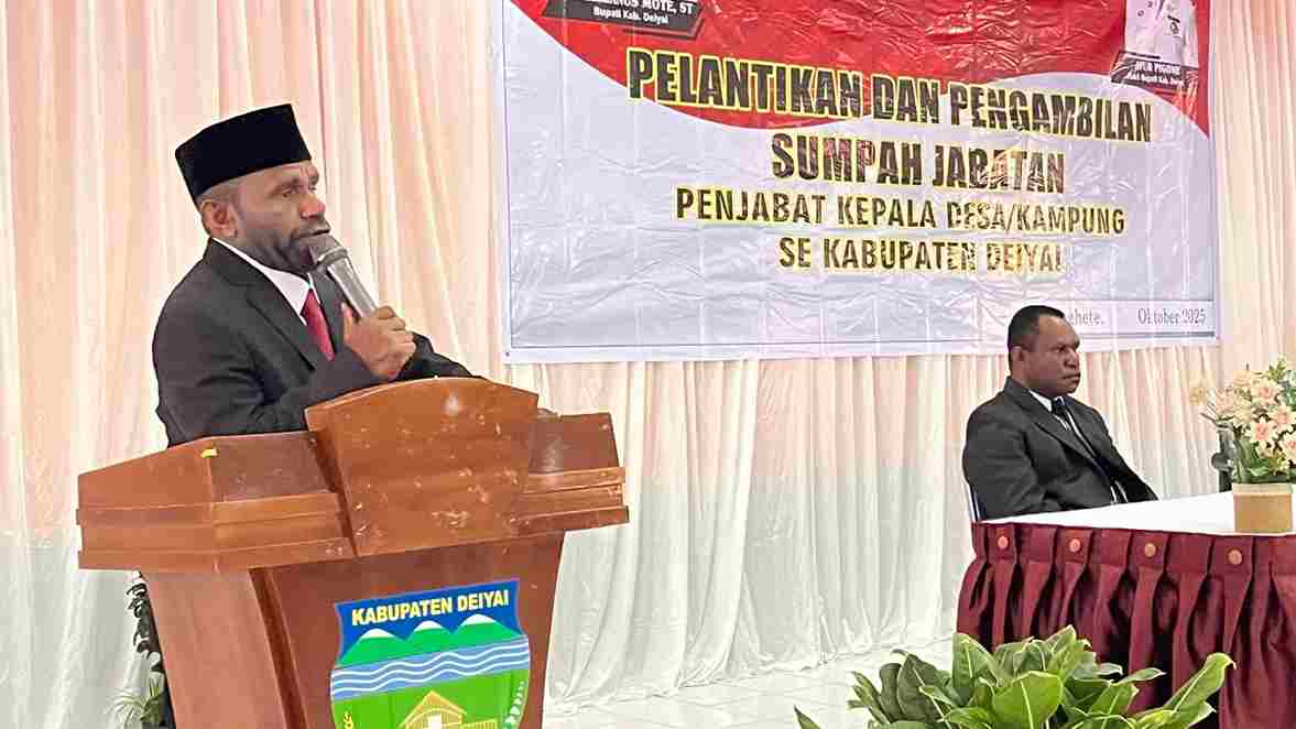 Deiyai, 21 Oktober 2025 – Bupati Deiyai, Melkianus Mote, ST, secara resmi melantik dan mengambil sumpah jabatan 67 Penjabat Kepala Desa/Kampung se-Kabupaten Deiyai Tahap I. Kegiatan pelantikan berlangsung di Aula Sekretariat DPRD (Setwan) Waghete pada Selasa (21/10/2025), dan diselenggarakan oleh Dinas Pemberdayaan Masyarakat dan Kampung (DPMK) Deiyai.