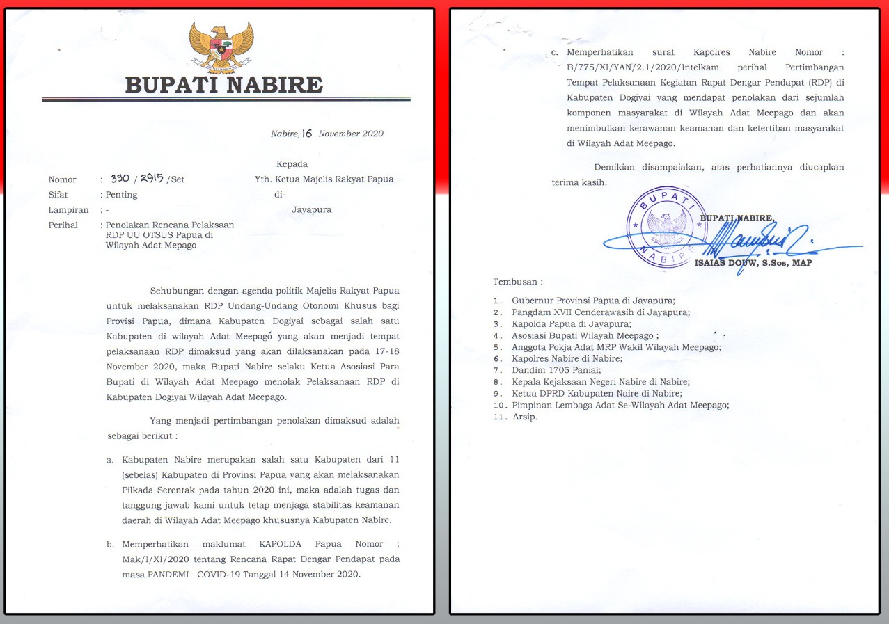 Penolakan tersebut tertuang dalam Surat Bupati Nabire Nomor 330/2915/Set tentang penolakan rencana pelaksanaan RDP Otsus Papua di wilayah adat Meepago, tertanggal 16 November 2020.