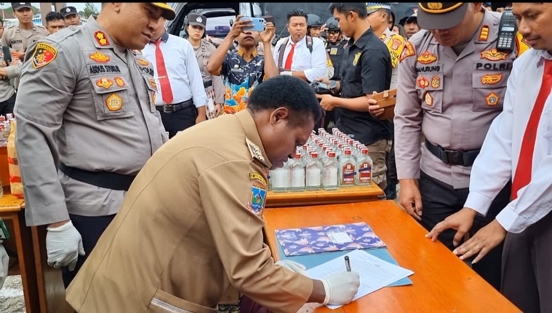 Acara dilanjutkan dan diawali dengan penandatanganan berita acara pemusnahan barang bukti oleh Kapolres Paniai, AKBP Abdus Syukur Felani, S.I.K., selanjutnya miras dimusnahkan dengan cara menuangkan isi miras ke dalam drum dan botolnya dipecahkan di dalam drum dan ada juga yang yang langsung melempar isi dan botol miras ke dalam drum yang sudah disediakan Polres Paniai yang diikuti Forkopimda dan personil.