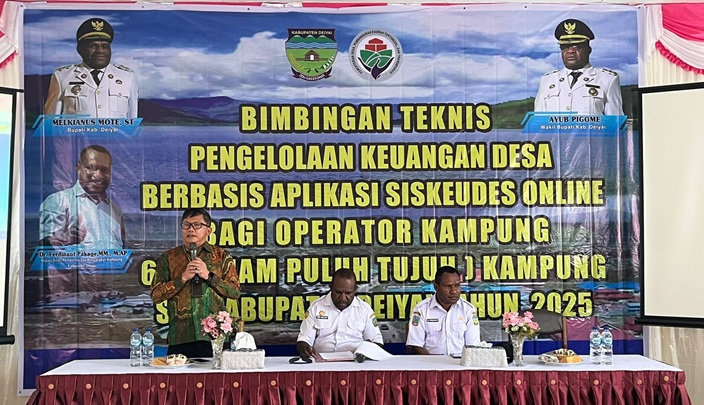 Sementara itu, Kepala DPMK Kabupaten Deiyai, Dr. Ferdinand Pakage, MM., M.AP, menyampaikan bahwa Bimtek ini menjadi langkah konkret untuk meningkatkan kapasitas aparatur desa. Ia menilai penerapan Siskeudes di 67 kampung merupakan sejarah baru bagi Kabupaten Deiyai, yang untuk pertama kalinya menerapkan sistem digital terintegrasi dalam pengelolaan keuangan desa.