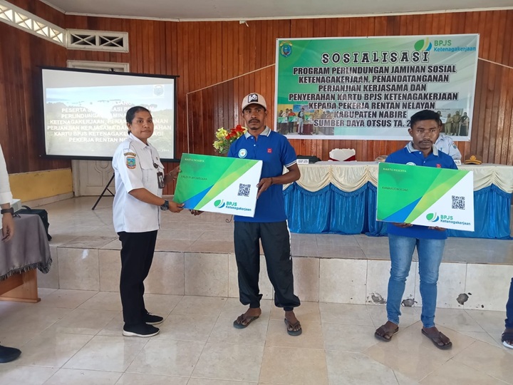 Dalam kegiatan tersebut, Kepala Dinas Perikanan Nabire, Anton Pekei, S.Sos, menyerahkan secara simbolis kartu BPJS Ketenagakerjaan kepada perwakilan nelayan. Ia menyampaikan bahwa program ini dibiayai melalui Dana Otonomi Khusus (Otsus) dan diperuntukkan khusus bagi nelayan Orang Asli Papua (OAP).