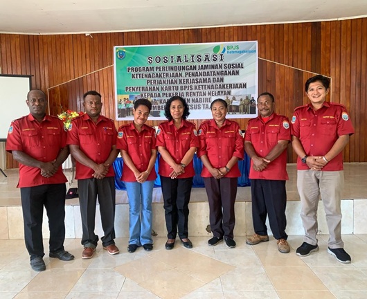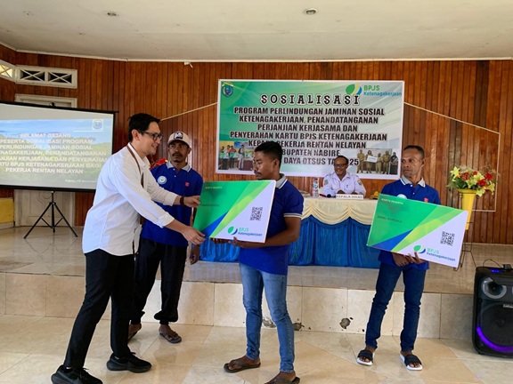 Nabire, 19 November 2025 – Dinas Perikanan Kabupaten Nabire melaksanakan Sosialisasi Program Perlindungan Jaminan Sosial Ketenagakerjaan bagi pekerja rentan nelayan, sekaligus penandatanganan perjanjian kerja sama dan penyerahan kartu BPJS Ketenagakerjaan di Ruang Serba Guna BBI, Jalan Poros Samabusa, Rabu (19/11).