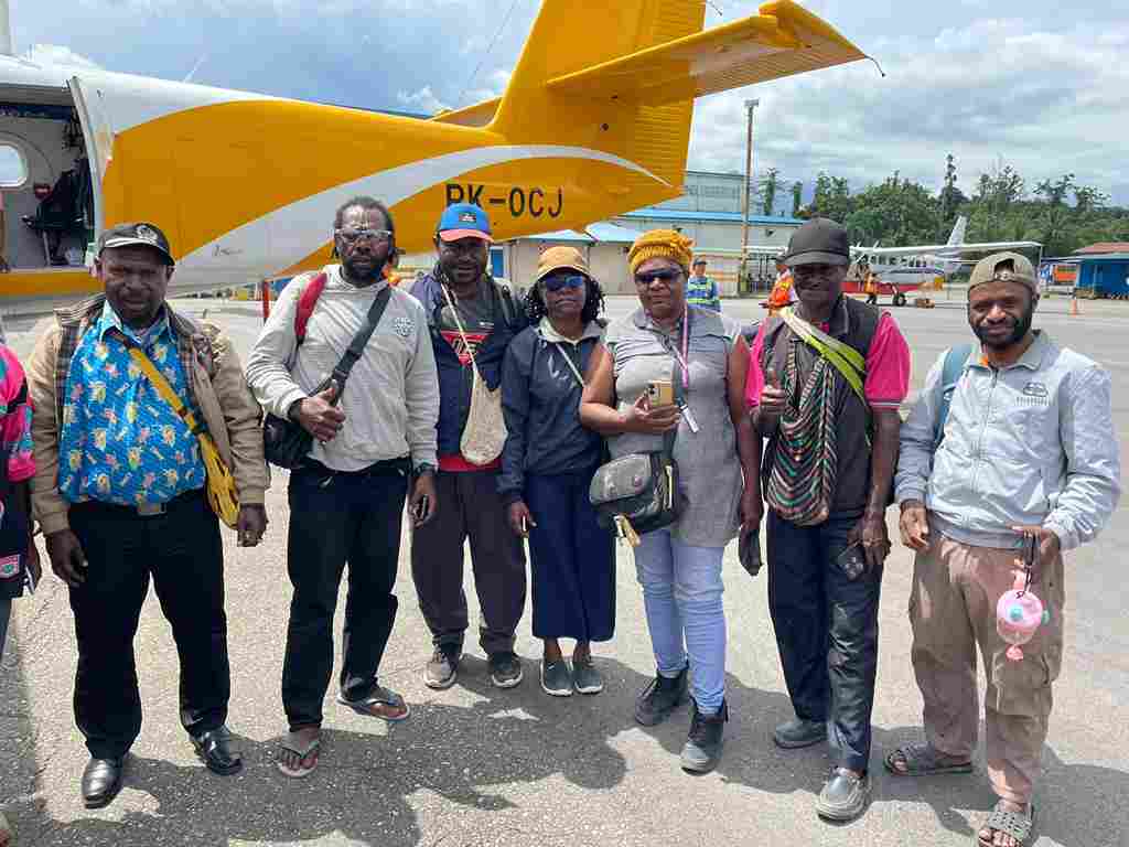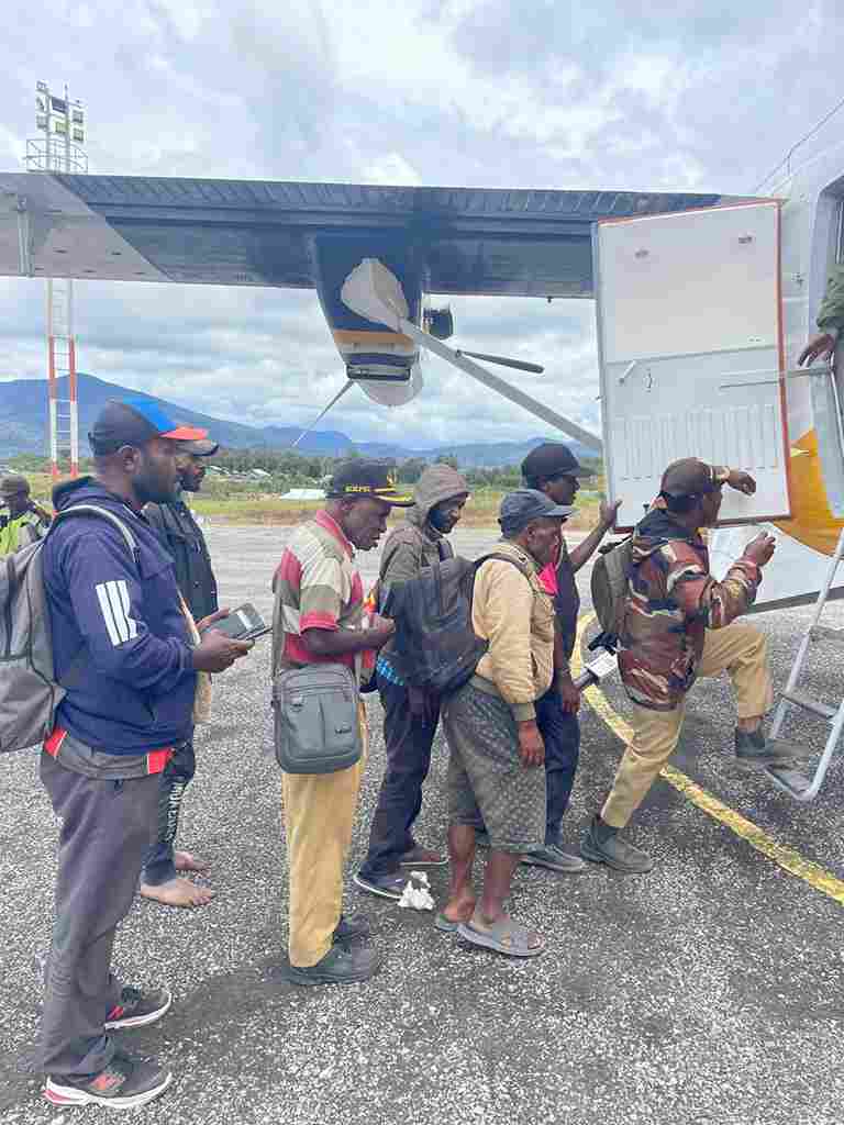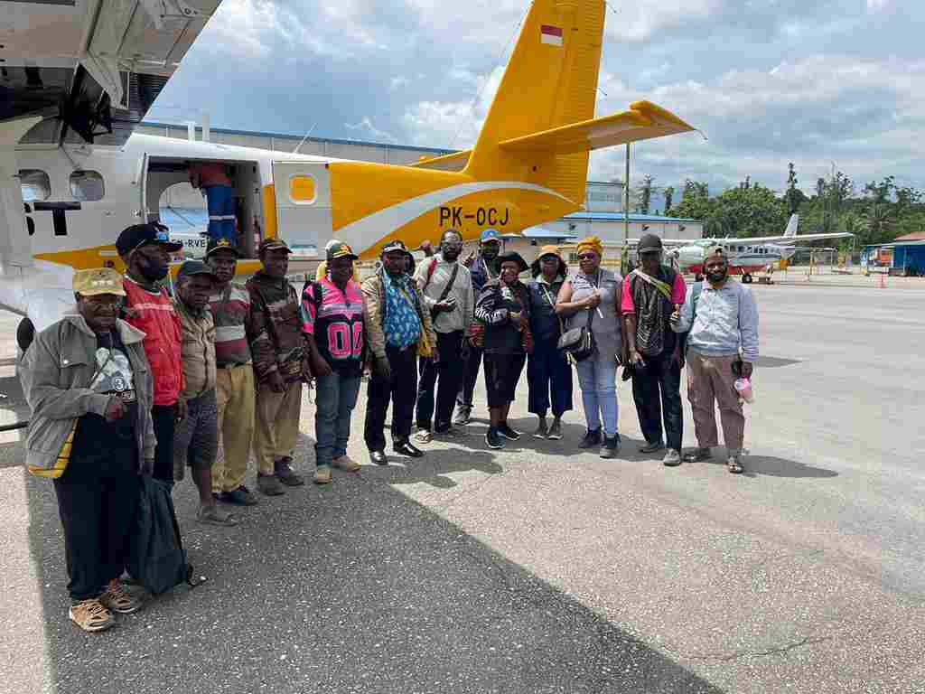 Rombongan bertolak melalui jalur udara dari Timika setelah menyelesaikan serangkaian pelayanan bantuan pemerintah kabupaten kepada masyarakat di tiga distrik, yaitu Tigi, Tigi Timur, dan Tigi Barat, yang berlokasi di sekitar Ibu Kota Kabupaten Deiyai, Waghete.
