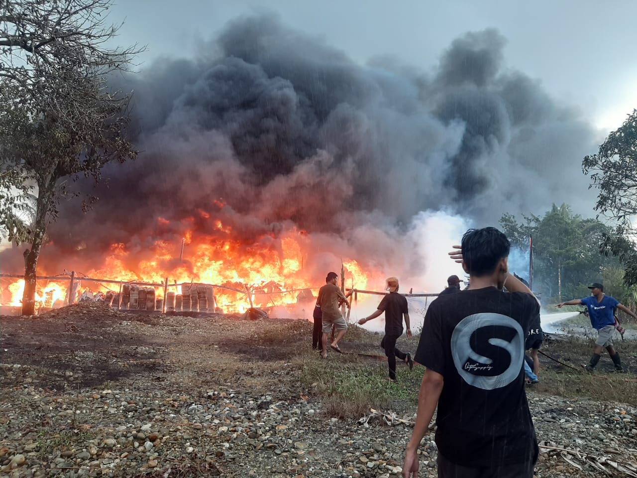 Menurut saksi mata, H. Bahrul, asap pertama kali terlihat dari atap gudang sebelum api dengan cepat membesar. “Karena gudang berisi kertas dan plastik, api cepat sekali menyebar,” ujarnya.