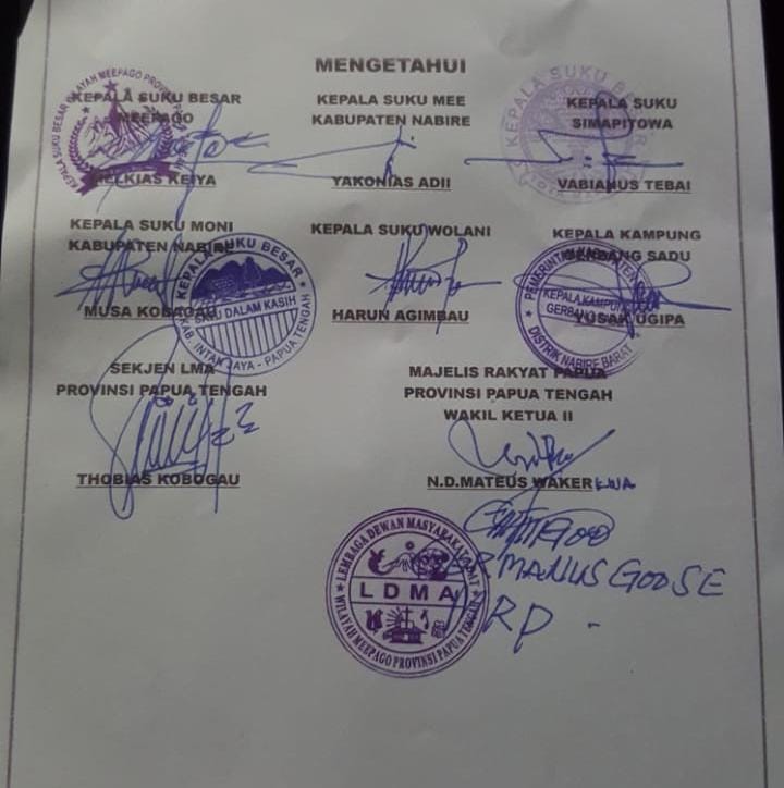 1. Pertikaian antara suku Mee dan suku Moni adalah permasalahan oknum dan keluarga. Kami kedua belah pihak telah sepakat dan menyelesaikan permasalahan tersebut secara damai.