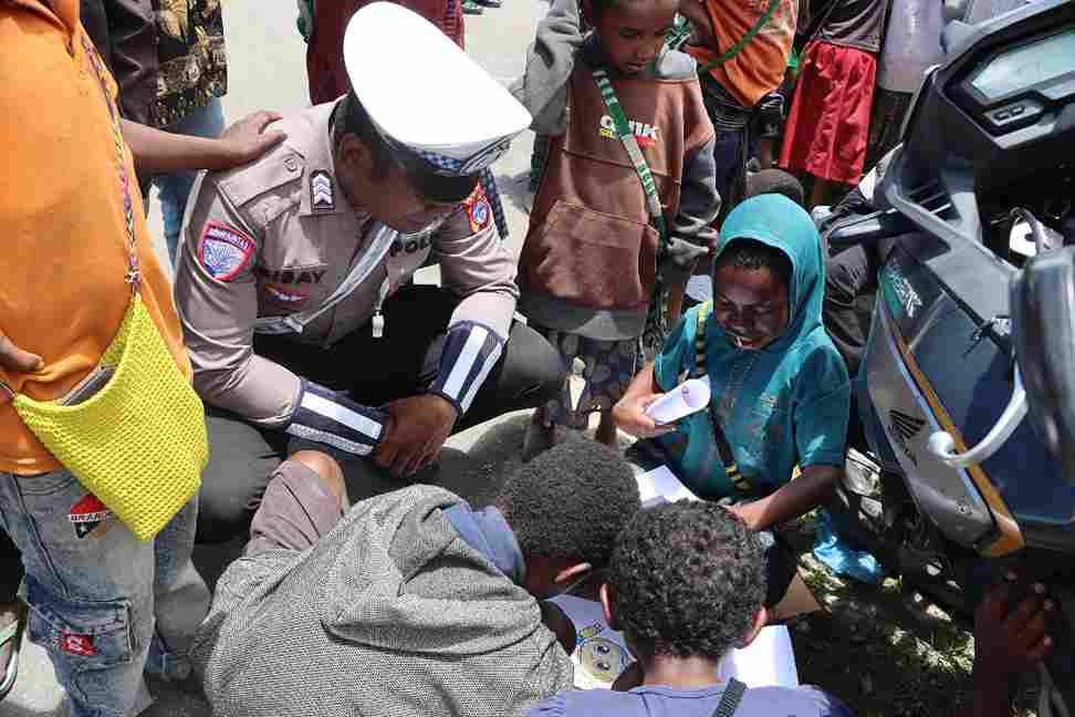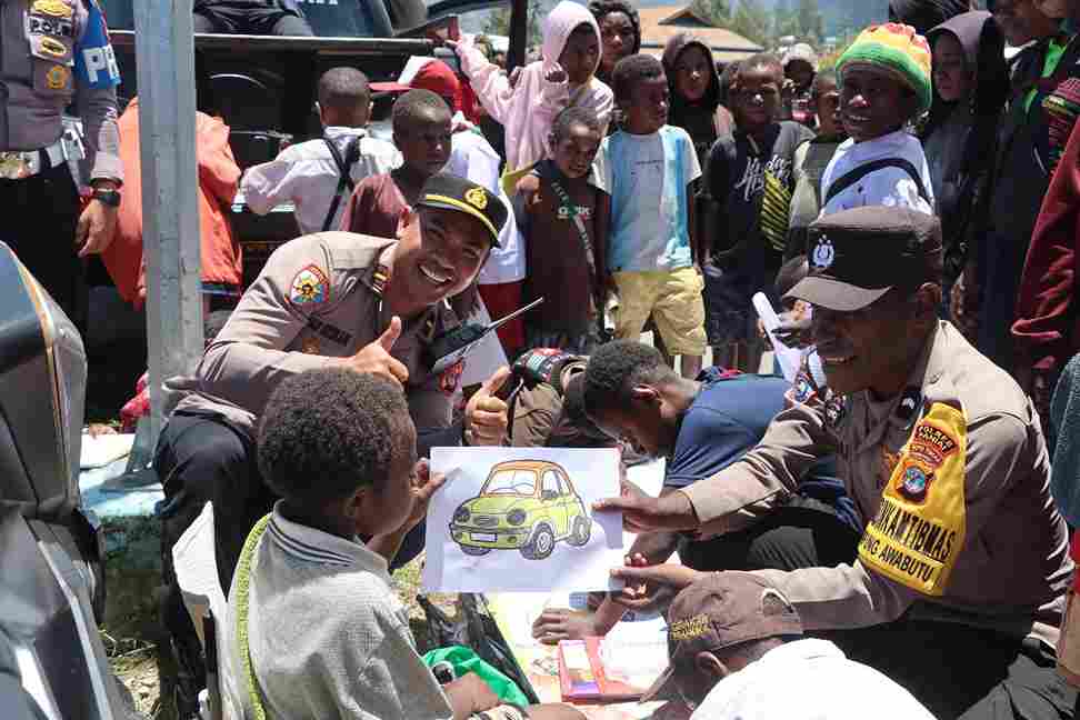 Tak hanya meriah di panggung utama, kegiatan ini juga diwarnai dengan momen menarik ketika sejumlah anggota Polres Paniai terlihat mengajar anak-anak menggambar di sela-sela acara. Awalnya hanya beberapa anak yang ikut, namun kemudian meningkat hingga mencapai 15–20 anak yang antusias belajar bersama para polisi.