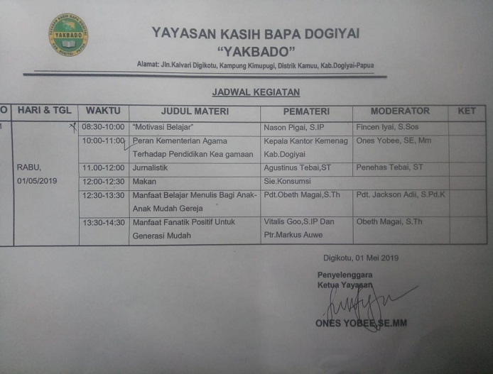 Sedangkan Ketua Yayasan Yakbado, Ones Yobee, mengaku sangat bersyukur kegiatan ini bisa terselenggara. Ia berharap kegiatan ini bisa menjadi motivasi bagi peserta didik di sekolah keagamaan milik Gereja Kingmi di Dogiyai ini, serta berharap mina akan dunia Literasi & Jurnalistik di Dogiyai semakin berkembang dan akan lahir penulis-penulis hebat dari Dogiyai.