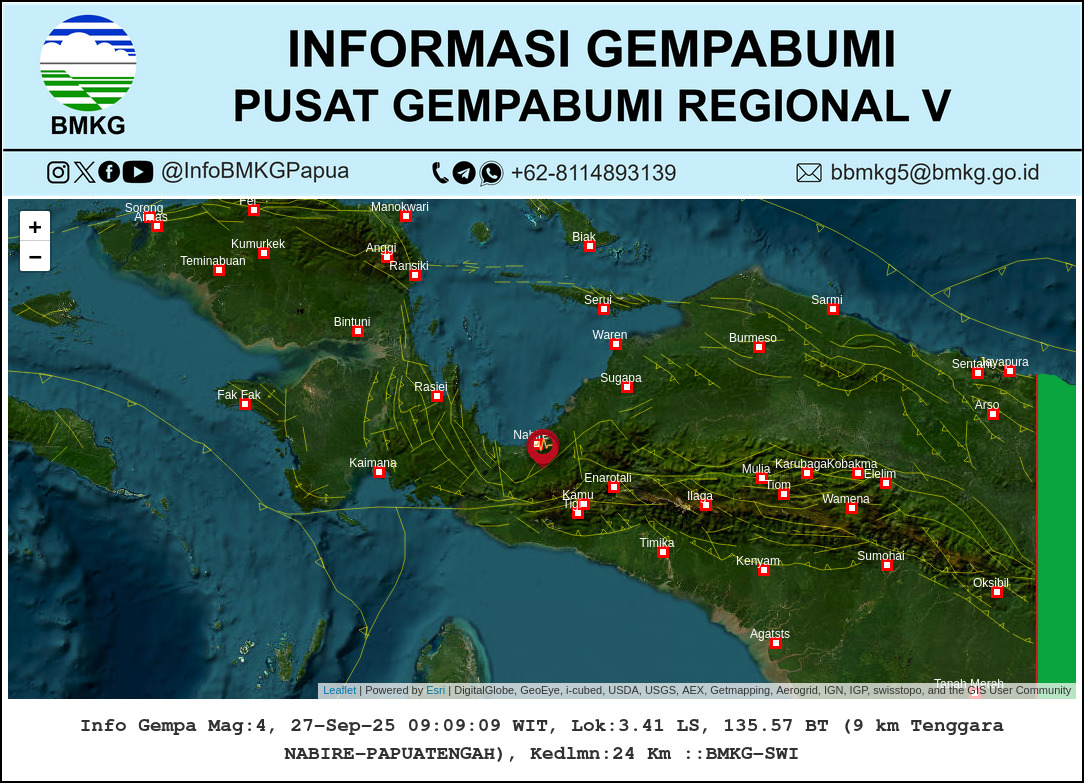 Nabire, 27 September 2025 – Badan Meteorologi, Klimatologi, dan Geofisika (BMKG) melaporkan gempa bumi dengan magnitudo 4 terjadi di wilayah Nabire, Papua Tengah, pada Sabtu (27/9/2025) pukul 09.09 WIT.