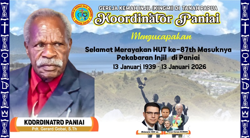 Paniai, 12 Januari 2026 – Koordinator Paniai, Pdt. Grand Gobai, S.Th, menyampaikan ucapan selamat memperingati Hari Ulang Tahun (HUT) ke-87 Injil Masuk di Paniai yang diperingati pada 13 Januari 2026. Peringatan ini menjadi momentum penting untuk mengenang masuknya Injil pertama kali ke Tanah Papua pada 13 Januari 1939.