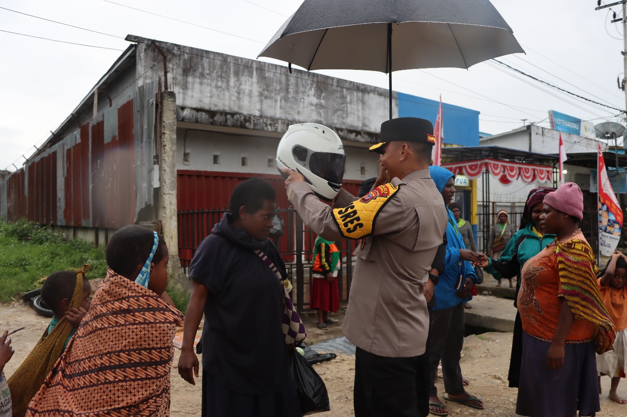 Kapolres Paniai, AKBP Roycke H. F. Betaubun, S.IP., S.I.K., M.Si., M.Tr.Opsla, bersama Kasat Lantas Polres Paniai, IPTU Slamet Sabaryanto, S.Sos., turut hadir langsung dalam kegiatan tersebut. Bantuan yang diberikan berupa paket sembako, helm, dan jaket bagi pengendara roda dua.