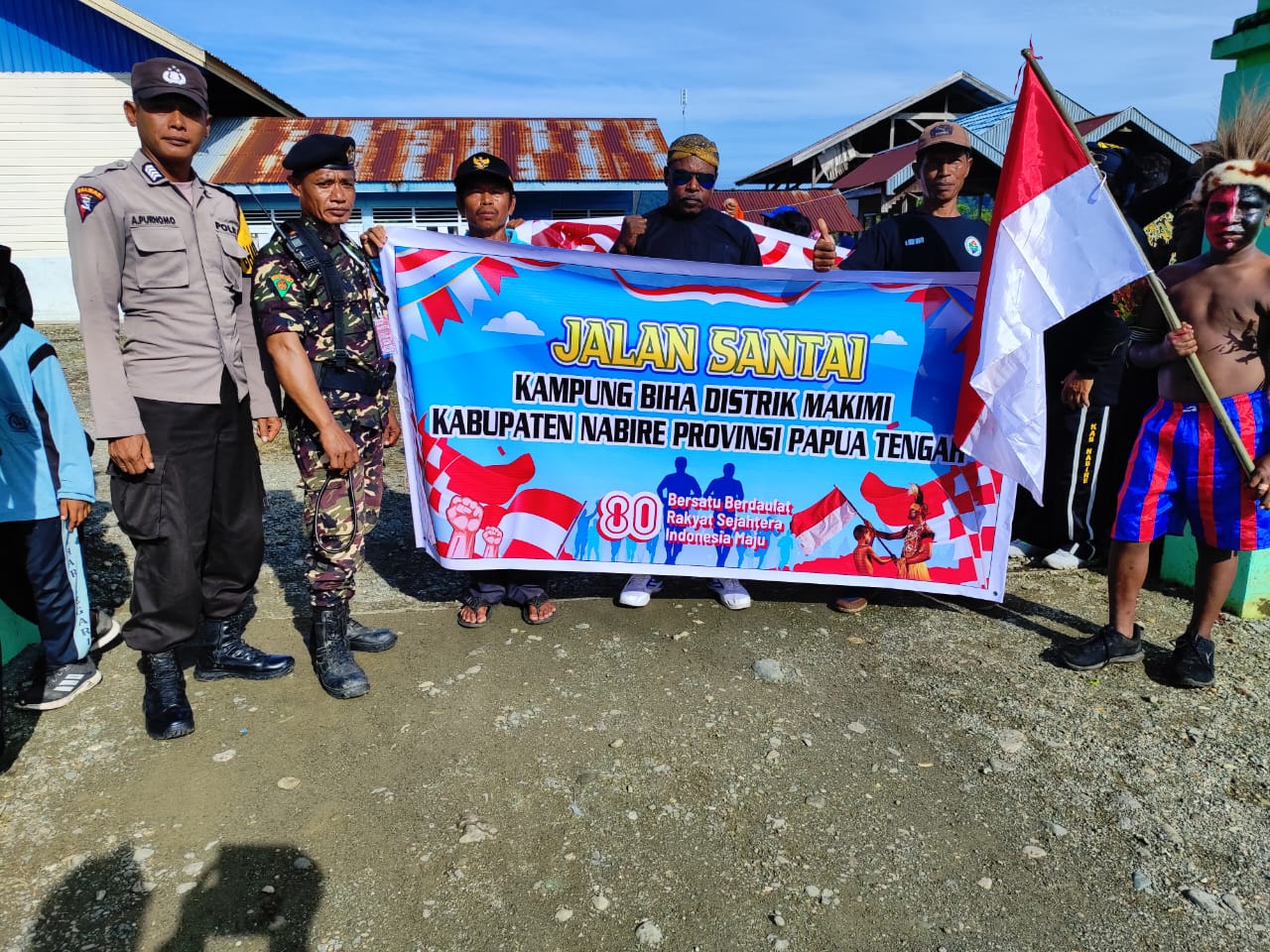Nabire, 18 Agustus 2025 – Suasana meriah dalam rangka merayakan HUT RI ke-80 terlihat di Kampung Biha, Distrik Makimi, Kabupaten Nabire, saat warga menggelar kegiatan jalan santai yang diikuti seluruh masyarakat, Senin (18/08).