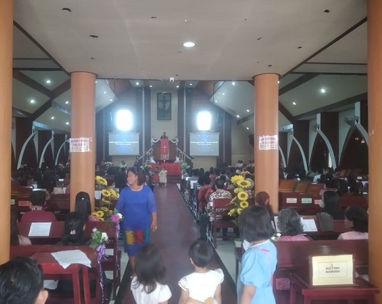 Ibadah kemudian dilanjutkan dengan menyanyikan bersama Suara Gembira 18:1-6 dengan judul “Siarkan ke Benua”