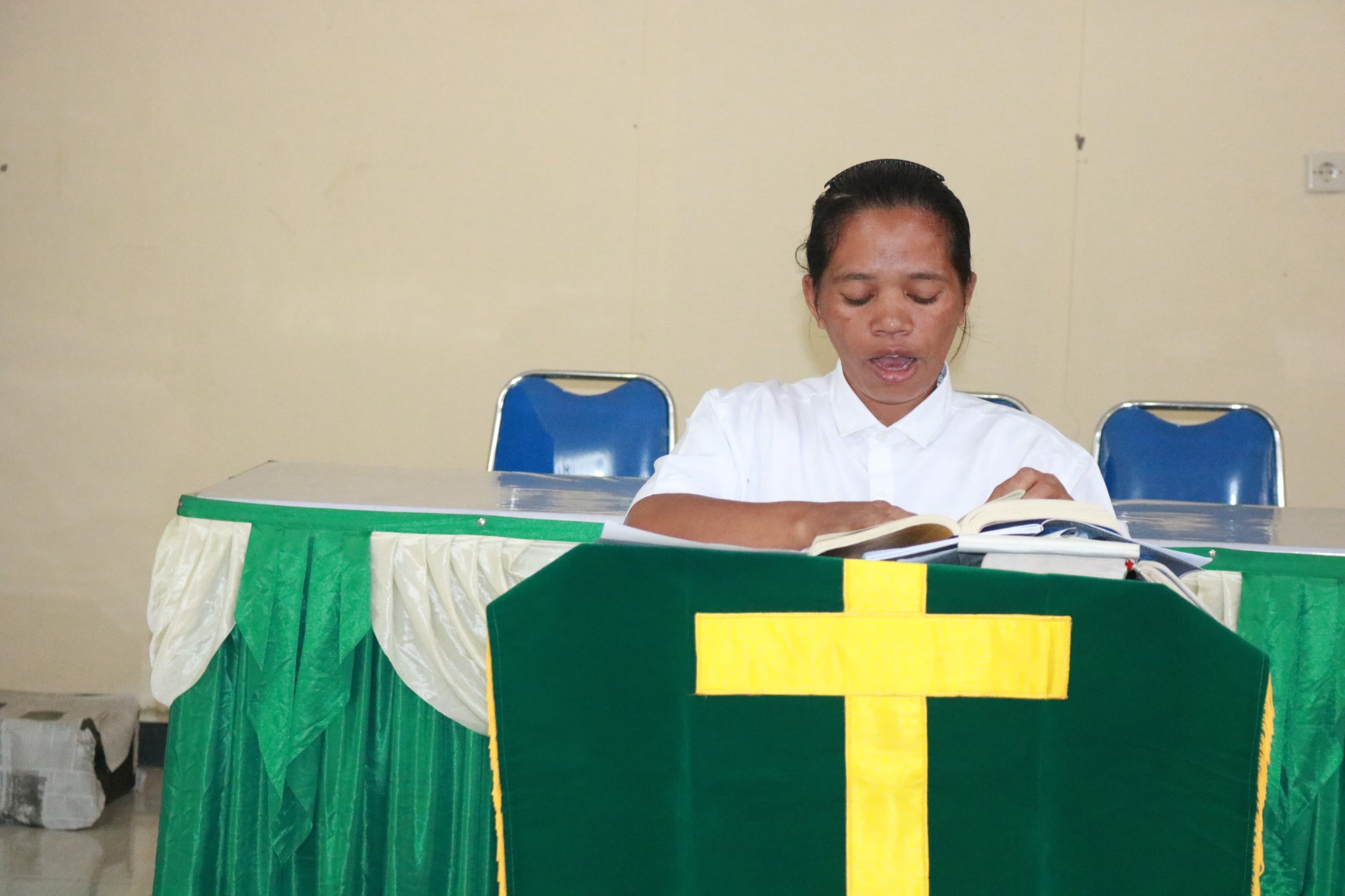Ibadah Oikumene ini dipimpin oleh Kristina Yulianita Sukur, S.Ag, seorang Pegawai P3K yang aktif dalam Bimas Katolik. Dalam bacaannya, Kristina mengambil kutipan dari Lukas 4:16-20 dengan tema utama “Mewartakan Kabar Baik.”