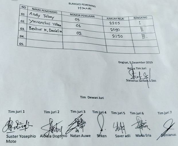 Setelah melalui penilaian cukup ketat, akhirnya dewan juri berhasil memilih tiga orang peserta sebagai juara pertama, kedua dan ketiga lomba cipta lagu mars dan hymne kabupaten Dogiyai.