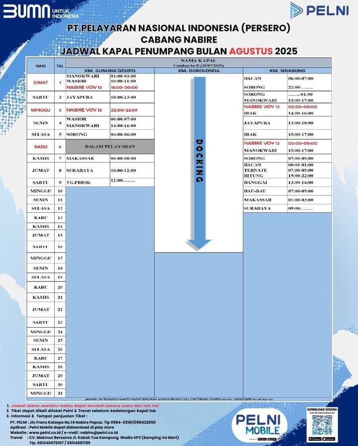 Nabire, 26 Juli 2025 – Bagi anda yang sedang membutuhkan informasi jadwal kapal penumpang Pelni, berikut ini, jadwal pelayaran kapal penumpang Pelni yang melayani pelabuhan laut Samabusa Nabire, Papua Tengah, di bulan Agustus 2025.