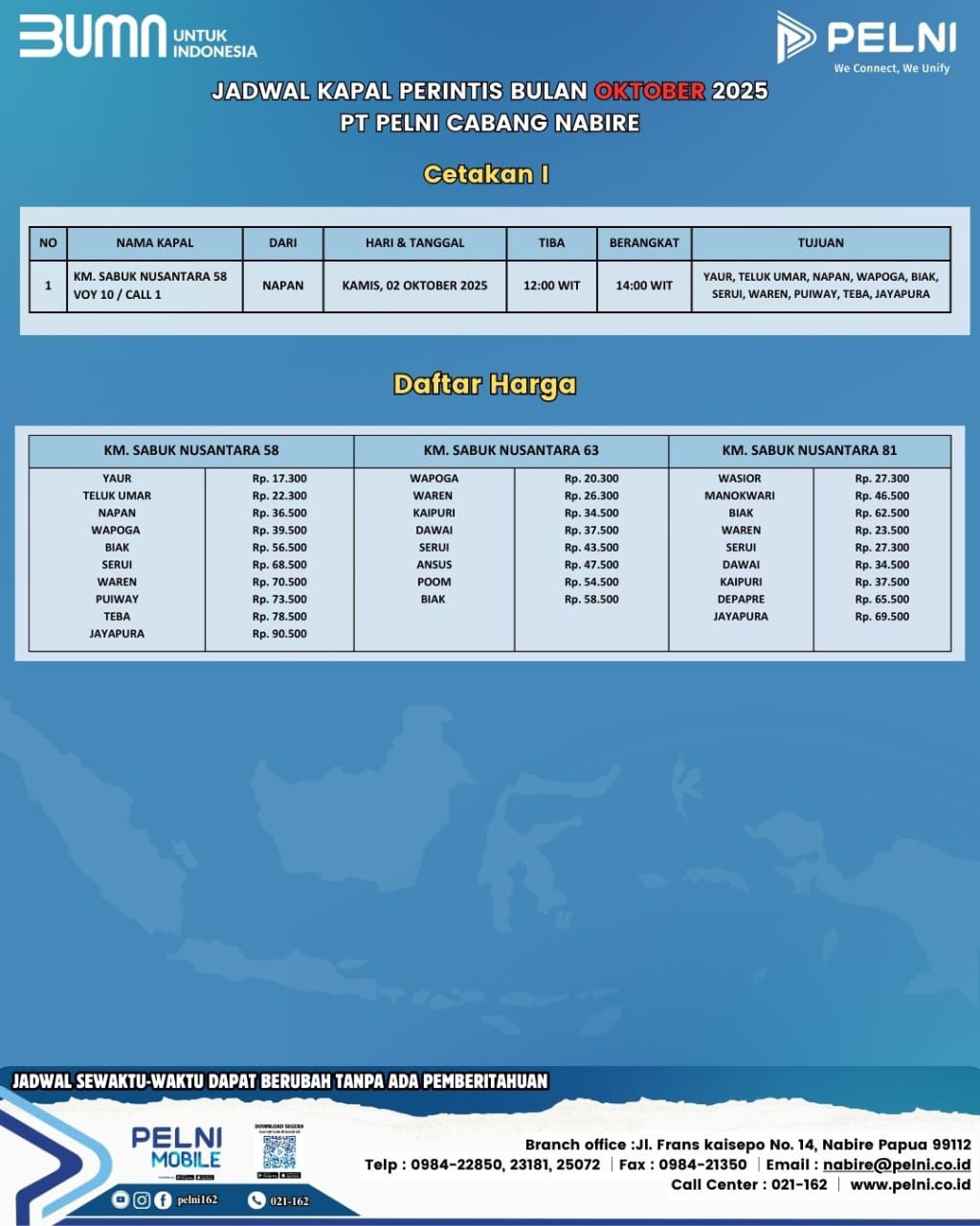 Nabire, 23 September 2025 – PT PELNI Cabang Nabire telah merilis jadwal keberangkatan kapal perintis untuk bulan Oktober 2025. Pada cetakan pertama, KM Sabuk Nusantara 58 (Voy 10/Call 1) akan berlayar dari Pelabuhan Napan pada Kamis, 2 Oktober 2025. Kapal dijadwalkan tiba pukul 12.00 WIT dan berangkat pukul 14.00 WIT.