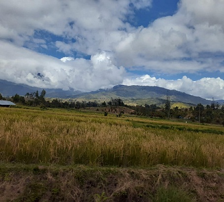 Pada ketinggian 1650 meter di atas permukaan laut di Wamena, terdapat hamparan sawah dengan tanaman padi yang menguning siap panen. Tanaman padi di sawah ini dibudidayakan oleh Suku Dani.