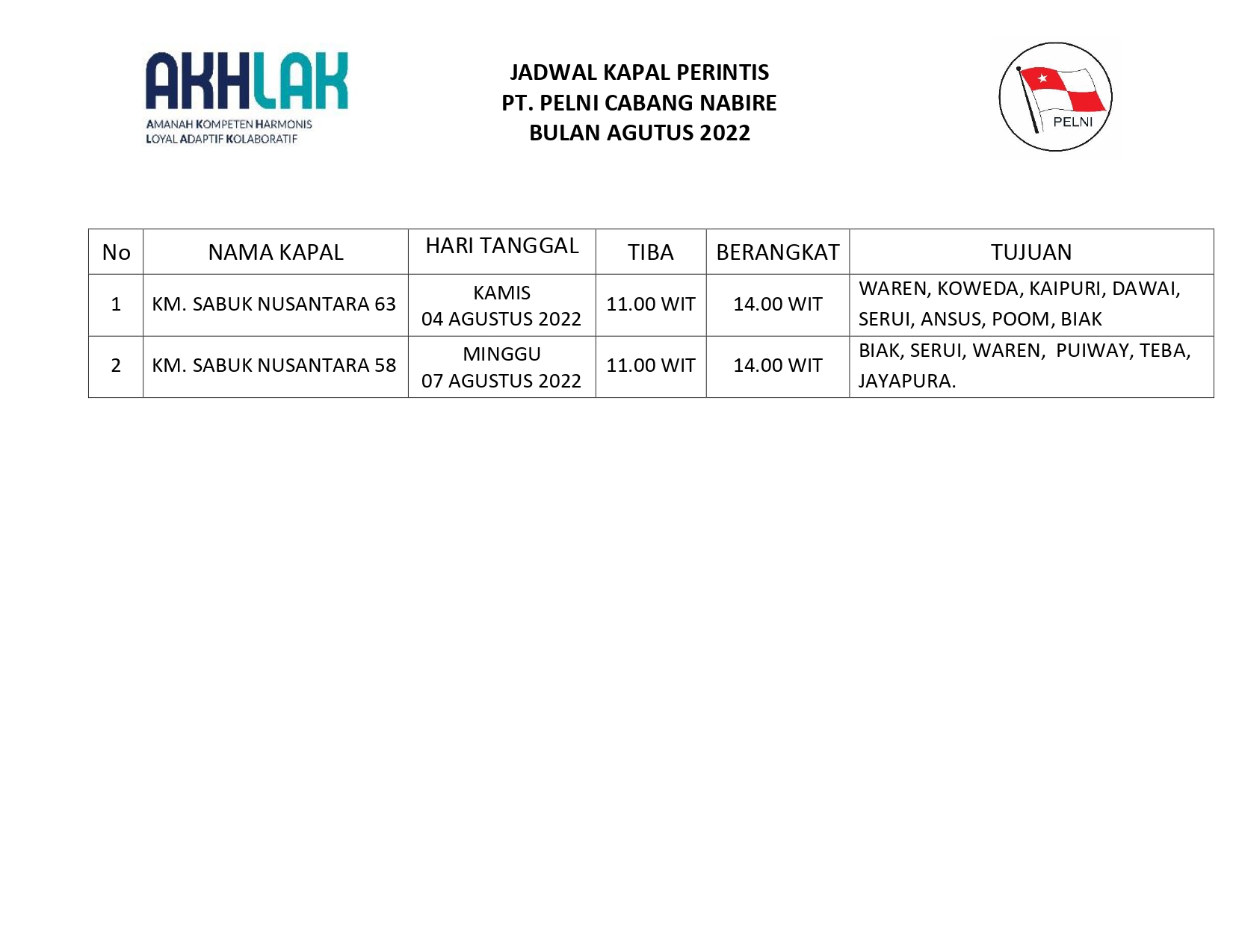 Berikut jadwal Kapal Perintis yang akan melayani pelabuhan Samabusa Nabire, selama bulan Agustus 2022 :