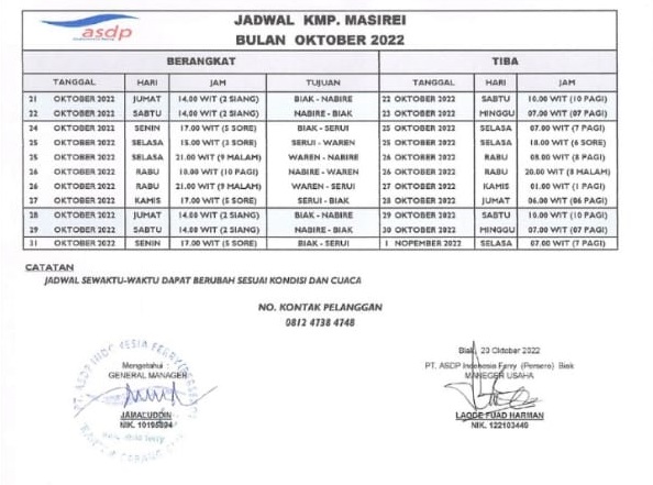 Berikut ini jadwal pelayaran kapal ferry, KMP Masirei dari tanggal 21-31 Oktober 2022 :
