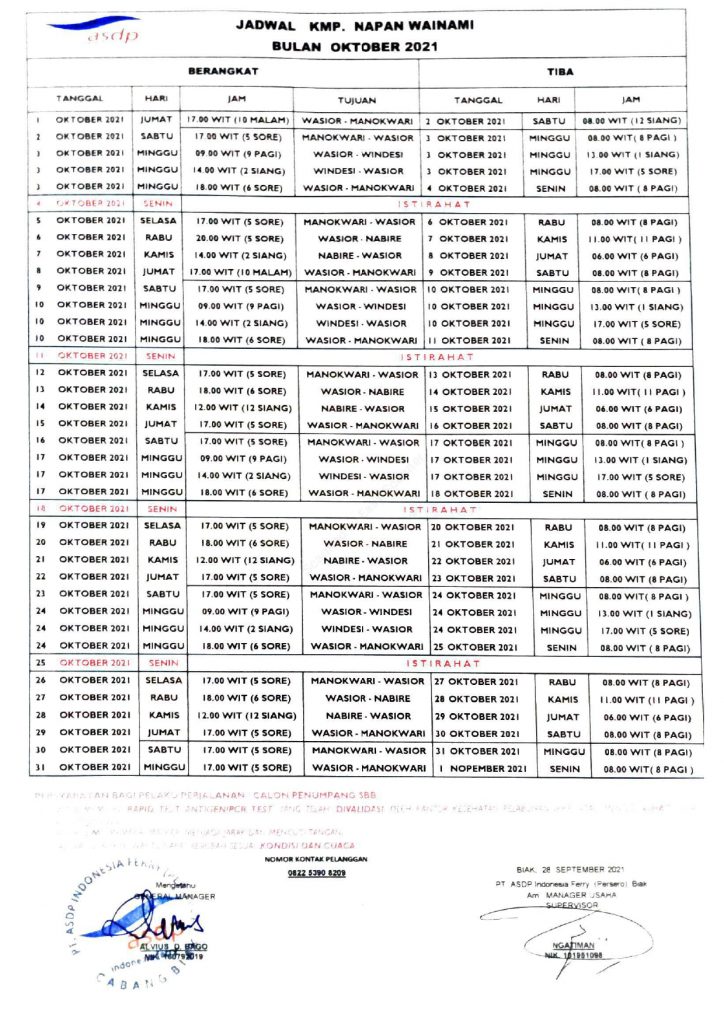 Berikut ini jadwal pelayaran kapal ferry, KMP Napan Wainami selama bulan Oktober 2021 :