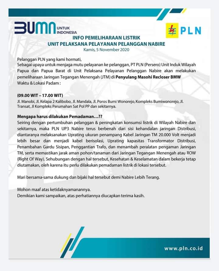 Atas ketidaknyamannya, PT. PLN Rayon Nabire memohon maaf kepada pelanggan PLN di Nabire.