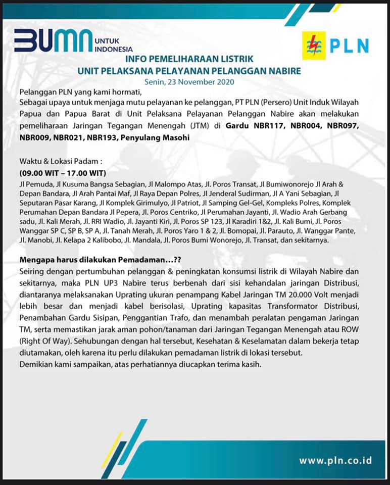 Nabire – Guna kehandalan jaringan Distribusi dan Pembangkit, maka PT. PLN Unit Induk Wilayah Papua & Papua Barat Unit Pelaksana Pelayanan Pelanggan Nabire akan melakukan pemadaman listrik.