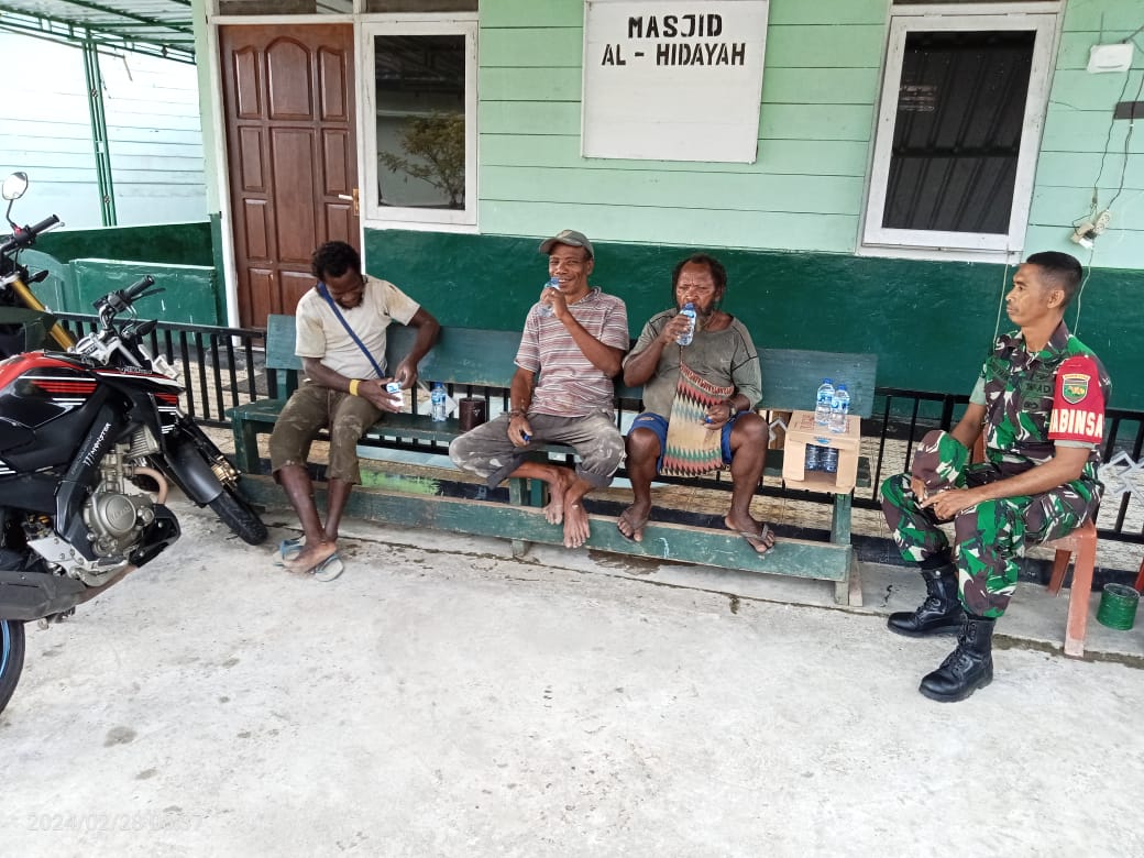 Nabire, Dalam rangka menjalin hubungan baik dengan masyarakat, Babinsa Koramil 1705-07/Siriwo, Serda Yoyon, melaksanakan Komunikasi Sosial (Komsos) dengan warga di Mesjid Al Hidayah, Jalan Trans Nabire-Ilaga, Kilometer 100, Distrik Siriwo, Nabire, Papua Tengah, Selasa (03/04/2024).