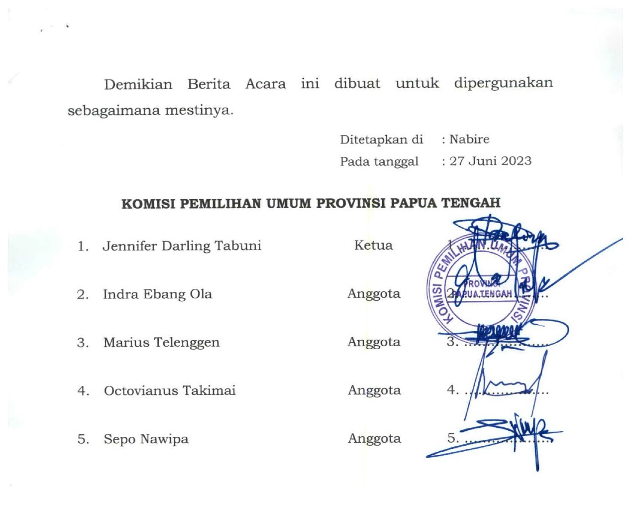 Penetapan Rekapitulasi tersebut dilaksanakan pada hari Selasa, (27/06/2023) di Kantor KPU Provinsi Papua Tengah, Jalan A.Gobay, Nabire. Hal tersebut sesuai berita acara Nomor : 40/PL.01.2-BA/94/2023.