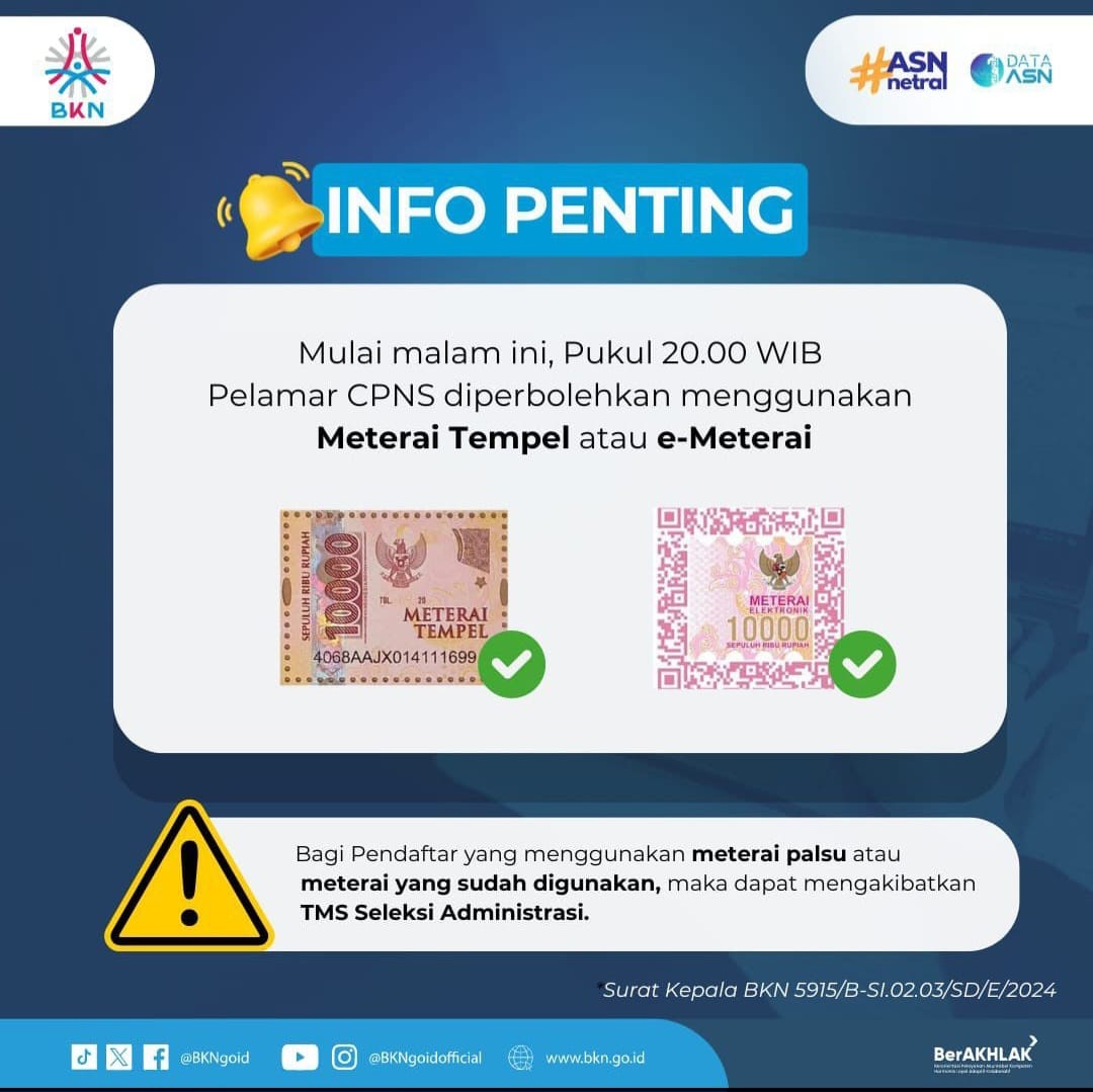 BKN juga menegaskan bahwa Panitia Seleksi Instansi akan melakukan verifikasi keabsahan meterai yang digunakan oleh para pendaftar. Oleh karena itu, BKN menghimbau agar calon pendaftar tidak menggunakan meterai palsu atau yang sudah pernah digunakan, karena hal ini dapat menyebabkan status Tidak Memenuhi Syarat (TMS) pada tahap Seleksi Administrasi.