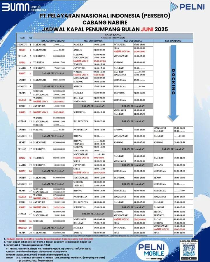 Nabire, 26 Juni 2025 – Kapal milik PT PELNI, KM Gunung Dempo, dijadwalkan tiba di Pelabuhan Samabusa Nabire pada Kamis (26/6) malam sekitar pukul 21.00 WIT. Kapal ini datang dari pelabuhan Jayapura dan akan melanjutkan pelayaran menuju Wasior.