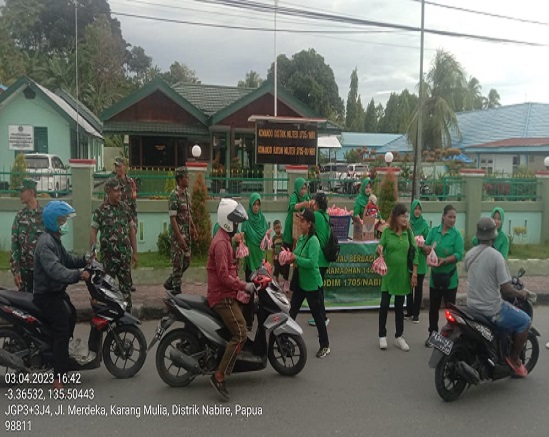 Puluhan anggota Koramil bersama anggota Persit KCK Koramil Nabire turut membagikan takjil kepada masyarakat, yang dipimpin langsung oleh Danramil Kapten Inf Hengki Sawaka.