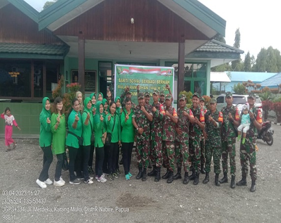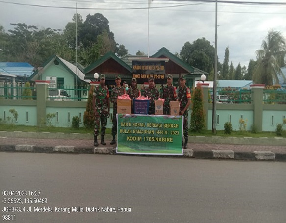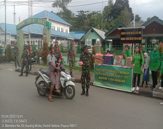 Nabire, Koramil 1705-01/Nabire berbagi kebahagiaan di bulan suci Ramadhan 1444 H dengan membagikan takjil kepada pengendara roda dua, roda empat maupun warga pejalan kaki yang melintas di depan Markas Koramil 01/Nabire, Jln. Merdeka, Kelurahan Karang Mulia, Distrik Nabire, Kabupaten Nabire, Papua Tengah, Senin, (03/04/2023).
