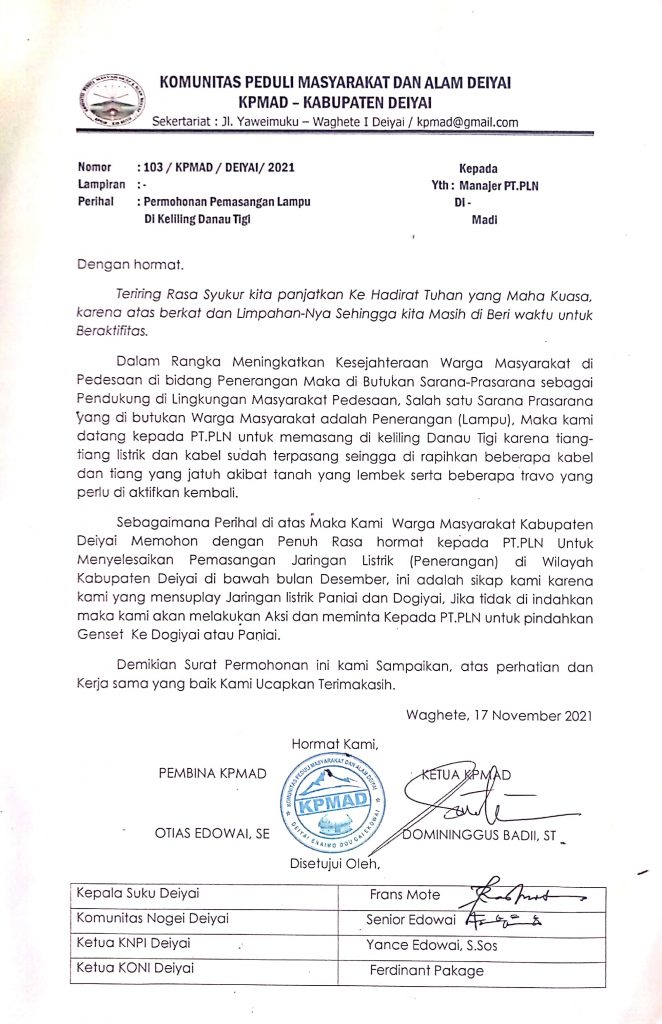 Deiyai, Komunitas Peduli Masyarakat dan Alam Deiyai (KPMAD) mendesak PT. PLN untuk segera menyelesaikan proses pemasangan dan penyambungan listrik di wilayah Deiyai terutama di sekitar wilayah Danau Tigi.