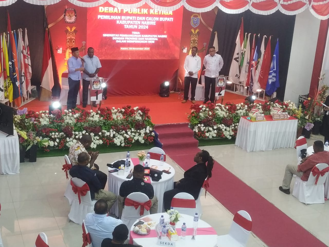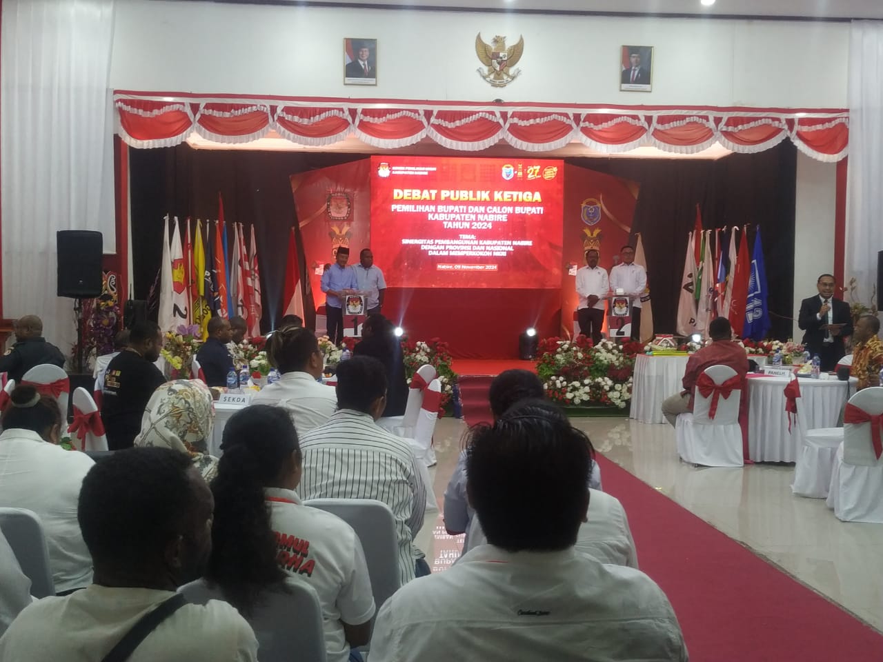 Nabire, 10 November 2024 – Komisi Pemilihan Umum (KPU) Kabupaten Nabire menggelar debat publik ketiga untuk pasangan calon Bupati dan Wakil Bupati dalam rangka Pemilihan Kepala Daerah (Pilkada) 2024, Sabtu (09/11.2024). Debat yang digelar di Auditorium RRI Nabire ini merupakan debat terakhir dari serangkaian tiga debat yang telah dilaksanakan sebagai bagian dari tahapan Pilkada Nabire.