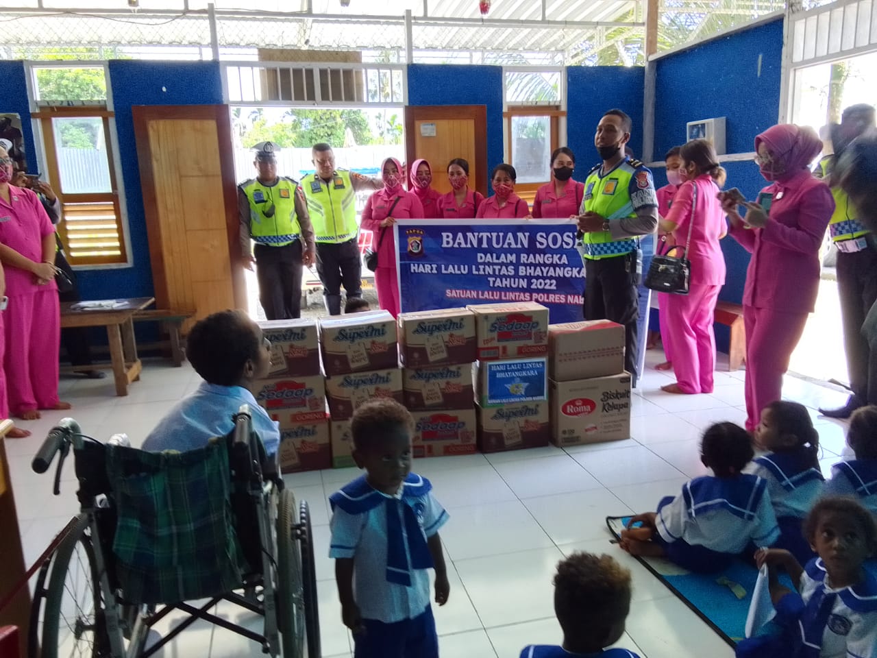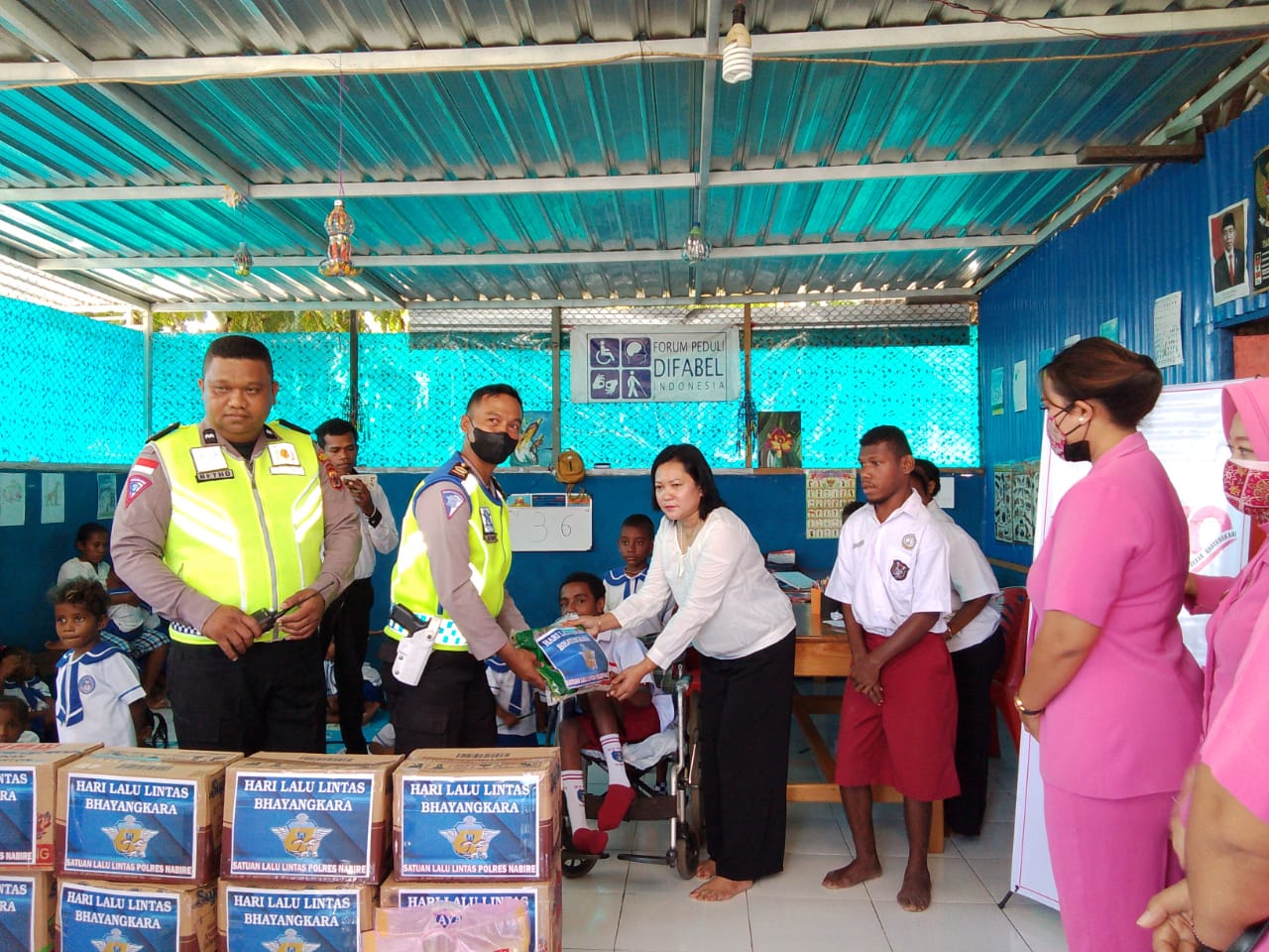 Nabire, Dalam rangka memperingati HUT Lalu Lintas Tahun 2022, jajaran Satuan Lalu Lintas Polres Nabire, melaksanakan kunjungan sosial ke Yayasan Difabel, Kelurahan Kalibobo, kabupaten Nabire, Senin (19/09/2022).