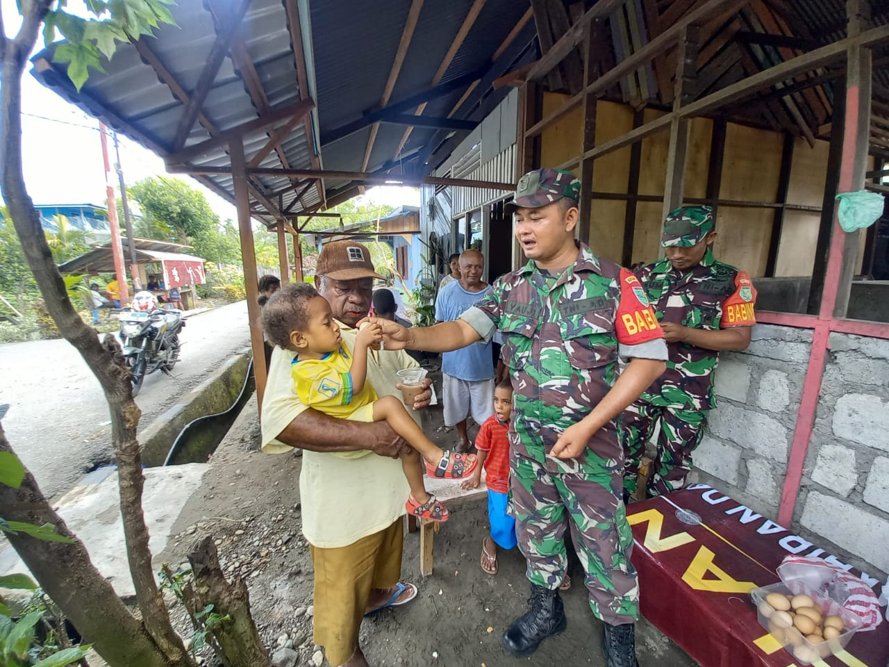Dalam kegiatan ini, Babinsa Koramil 1705-01/Nabire, Serka Senum dan anggota Babinsa lainnya memberikan telur, bubur kacang hijau dan susu kepada anak-anak sehingga pertumbuhan anak-anak bisa lebih baik.