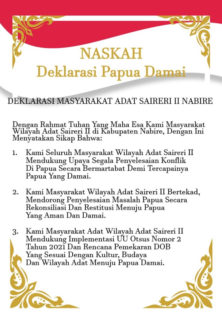 Selain itu dalam acara ini juga dibacakan naskah deklarasi damai Papua di wilayah adat Saireri II.